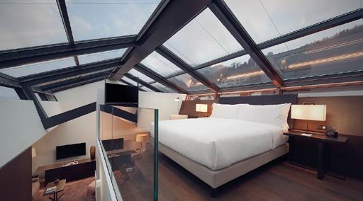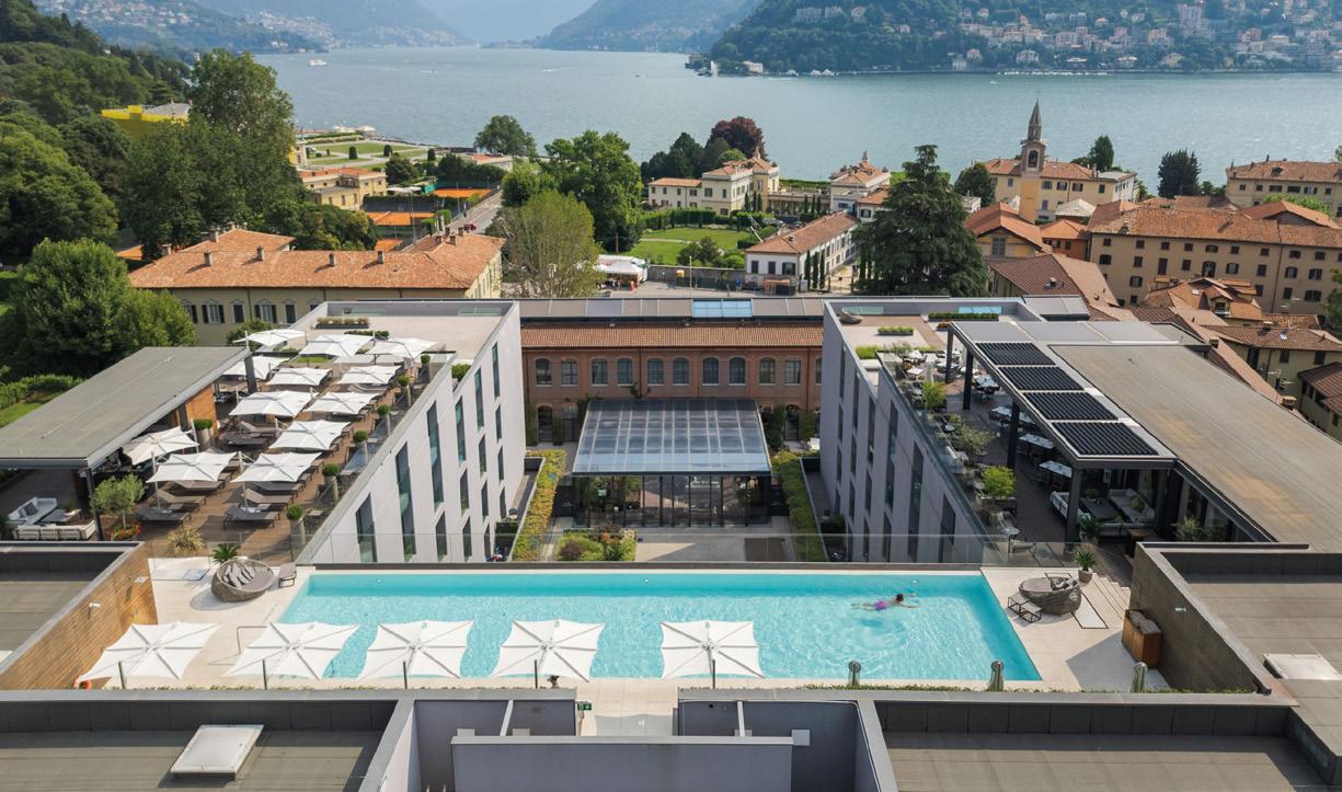 The hotel is located in an enviable spot, in a former silk factory. The location grants stunning views of the lake and surrounding mountains, best enjoyed from the rooftop terrace with a restaurant and bar, and the all-season infinity pool.