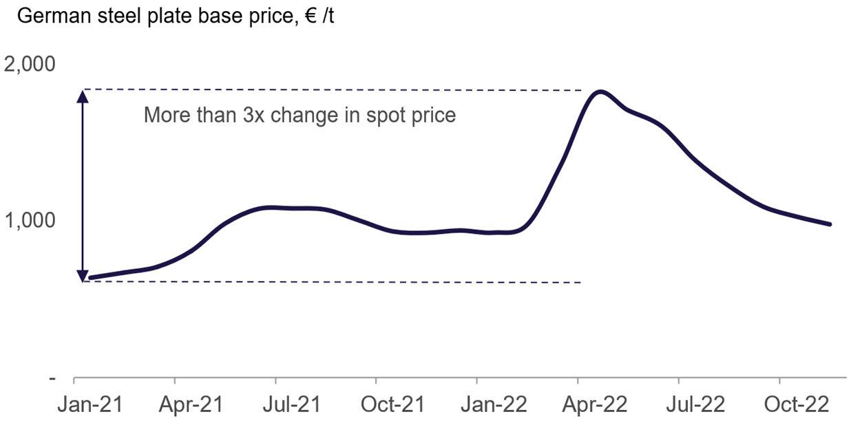 Steel prices are volatile and purchasing teams in offshore wind companies face the challenge of market timing or require complex risk management. CRU discovers plate prices globally, including across Asia, but Figure 3 shows a cautionary example of the volatility European plate consumers faced between 2021 and 2022.