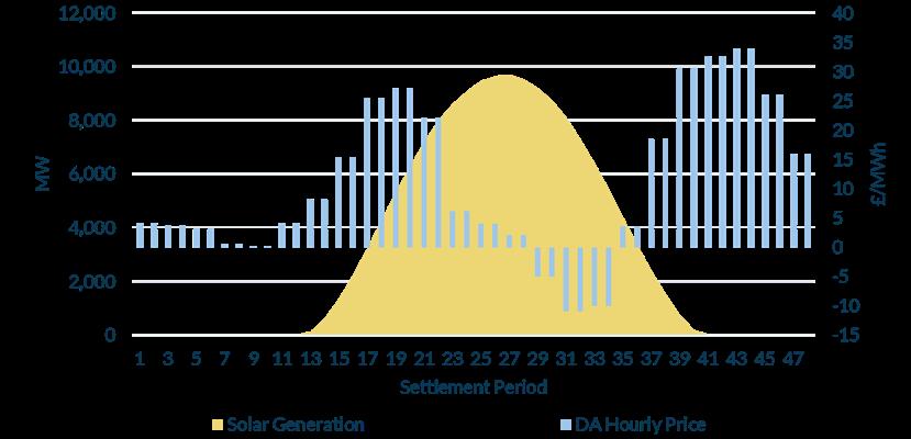 Price cannibalisation could, for example, occur on a warm and windy summer’s day, a period of the year in which domestic power demand is already lower and weather conditions are conducive to strong renewable generation. With wind and solar generating simultaneously at high levels, and demand being low, the system becomes saturated with low or zero-marginal cost energy, with the merit order effect pushing wholesale prices down, often approaching zero or even turning negative for short periods.