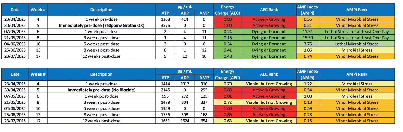 These attributes highlight the strong potential of grotan OX as a reliable, long-acting preservative biocide solution for both remediation and prevention of biogenic souring in oilfield environments. Its performance advantages are particularly relevant in reservoir systems with long residence times, highpressure injection operations, or restricted accessibility where frequent chemical dosing is not feasible.