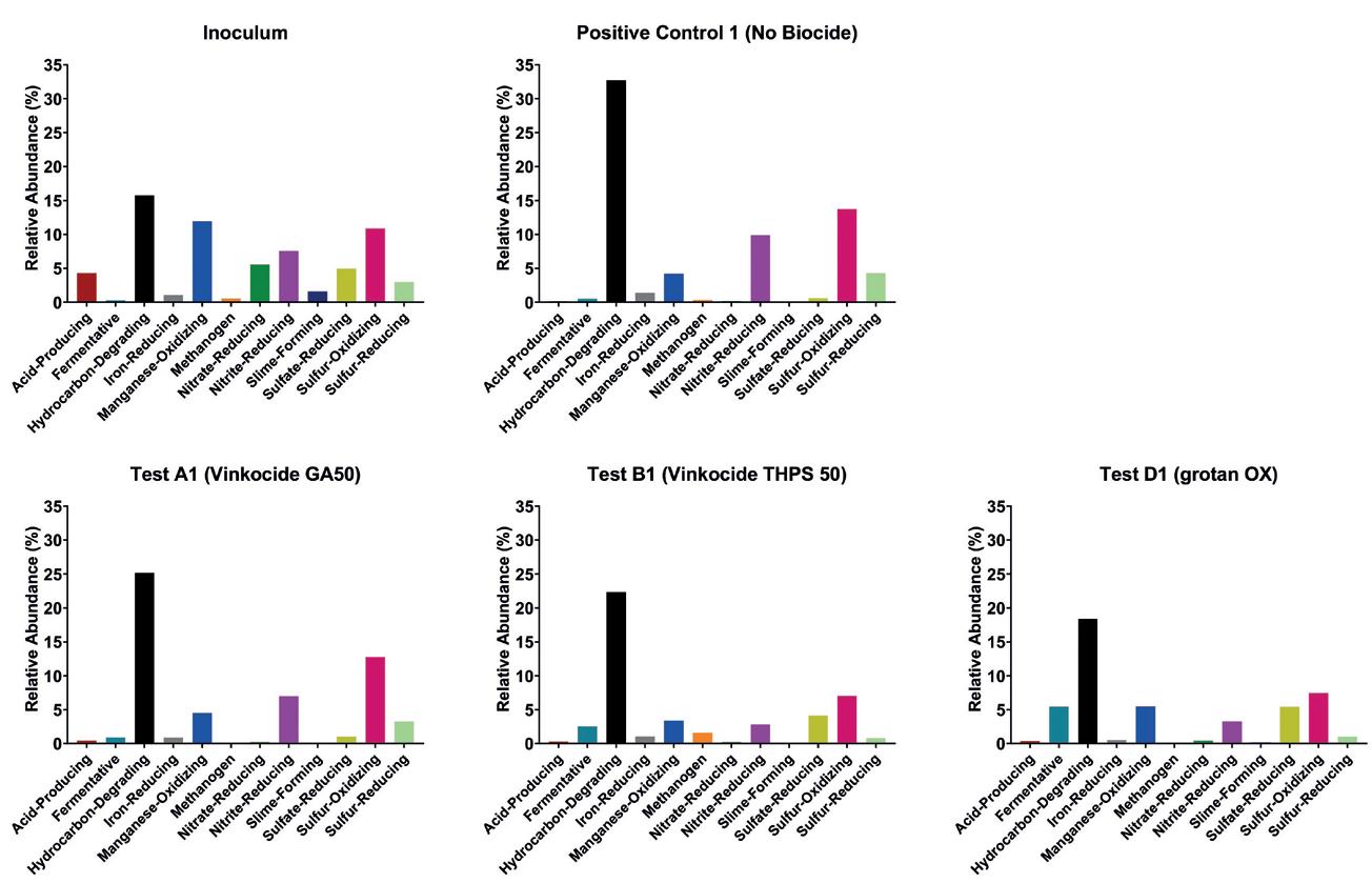 reducers and methanogens indicate ongoing sulfide and acid generation, presenting a dual corrosion–souring threat. grotan OX (D1) achieves stronger suppression of microbial activity relative to PC1 and B1. While hydrocarbon degraders and SRB persist, their populations are substantially reduced, with less dominance of fermenters and sulfidogens. The risk profile indicates controlled souring and moderated corrosion pathways, though localised biofilmdriven MIC remains possible. Overall, grotan OX supports better longterm control with reduced functional redundancy.