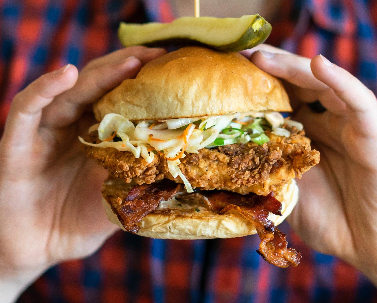 The Chicken Karaage Hash features marinated chicken thighs breaded and fried until perfectly crispy, then served on potatoes with pickled daikon and carrots. It’s finished with housemade mayo and signature hot sauce.