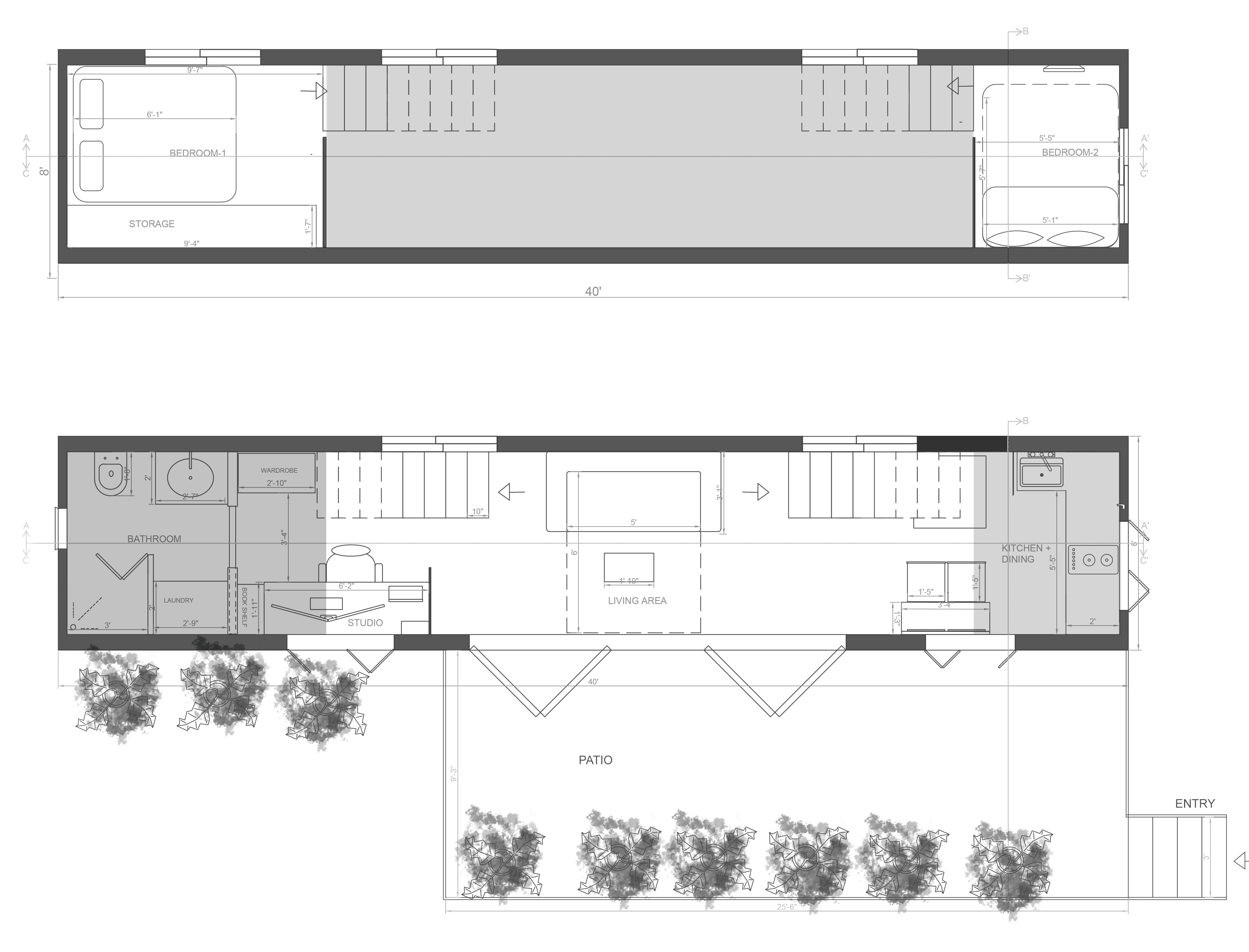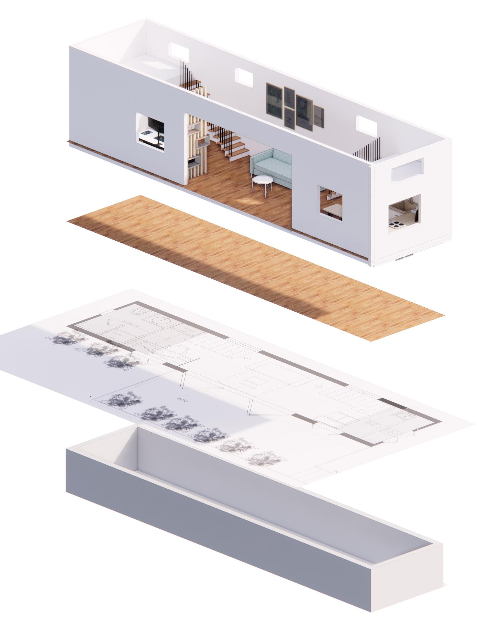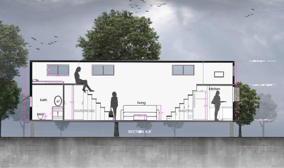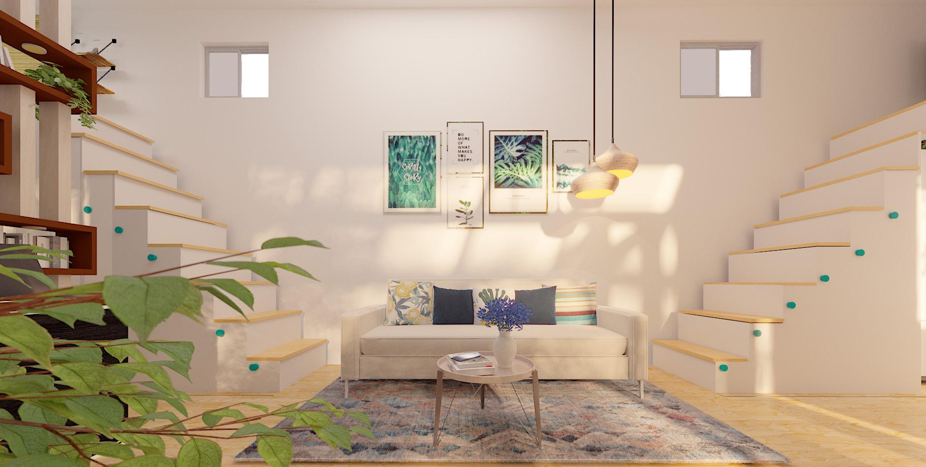 Having to design the space in connection with the context was a key consideration in the design. The space is designed in two levels to minimize space constrains. The lower level of the plan constitutes living area, kitchen, studio space and a bathroom. The upper level constitutes loft bedrooms . The upper level is acces-