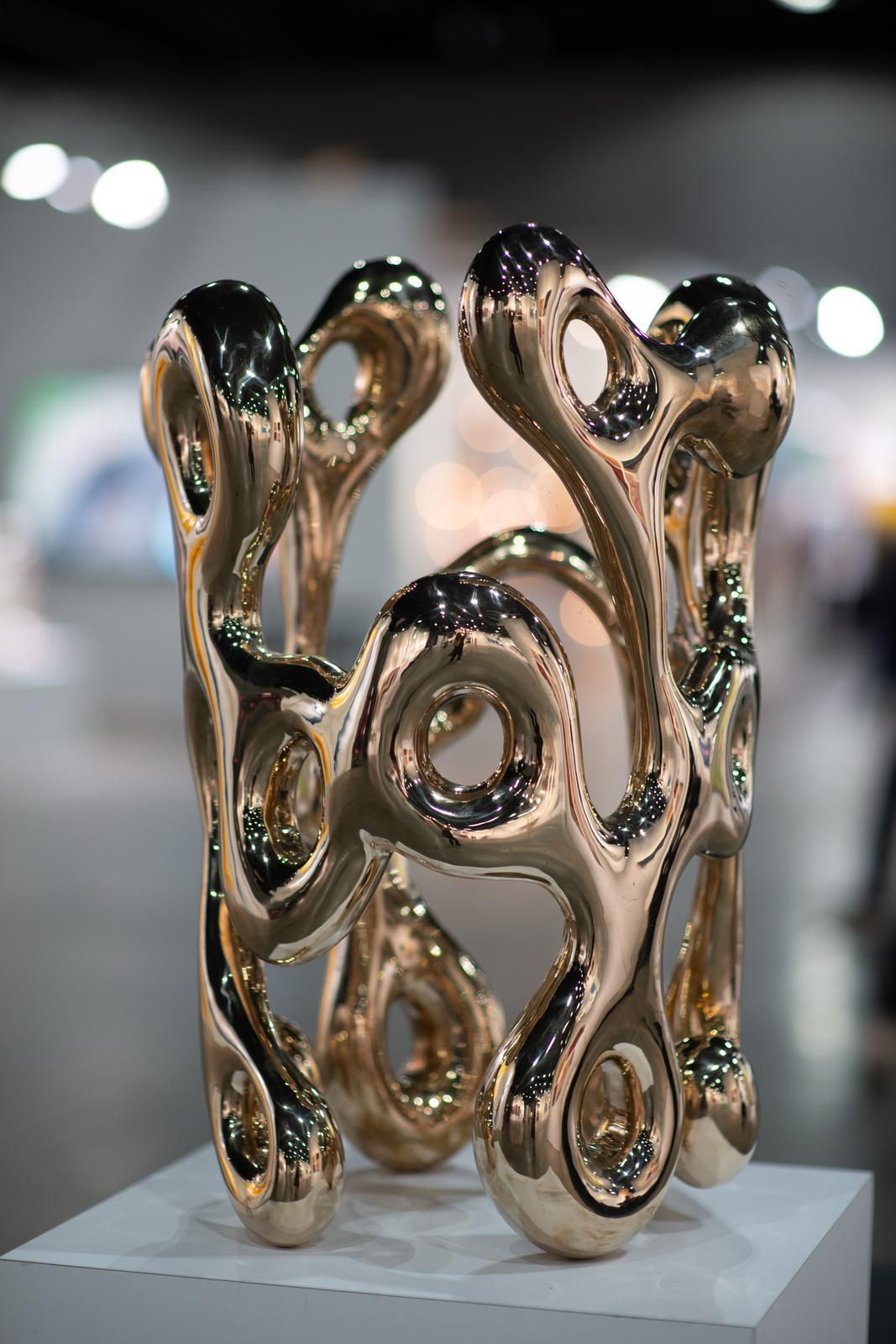 Working primarily with metals like aluminum and copper, Moon renders these emotions as organic movements captured in cold, industrial material. Despite the hardness of his medium, the sculptures pulse with warmth and quiet vitality, suggesting the persistent emotional undercurrents within a heavily ordered world.