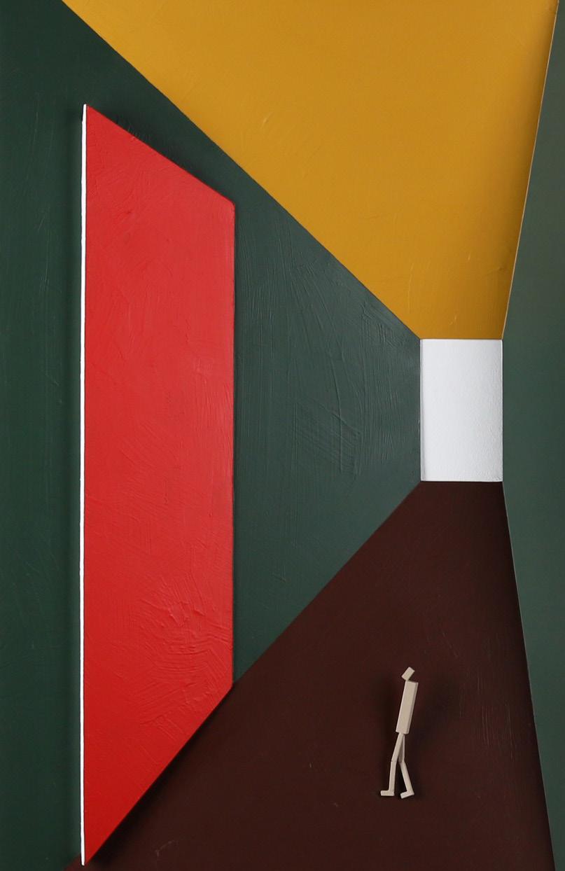 The “Including You and Me” series simplifies the human figure into geometric forms, portraying modern individuals confined within square frameworks. These boxed forms symbolize the structured society we live in – an architecture we’ve collectively built. Through this perspective, the artist observes and narrates the endurance and subtle resistance of those existing within these confines.