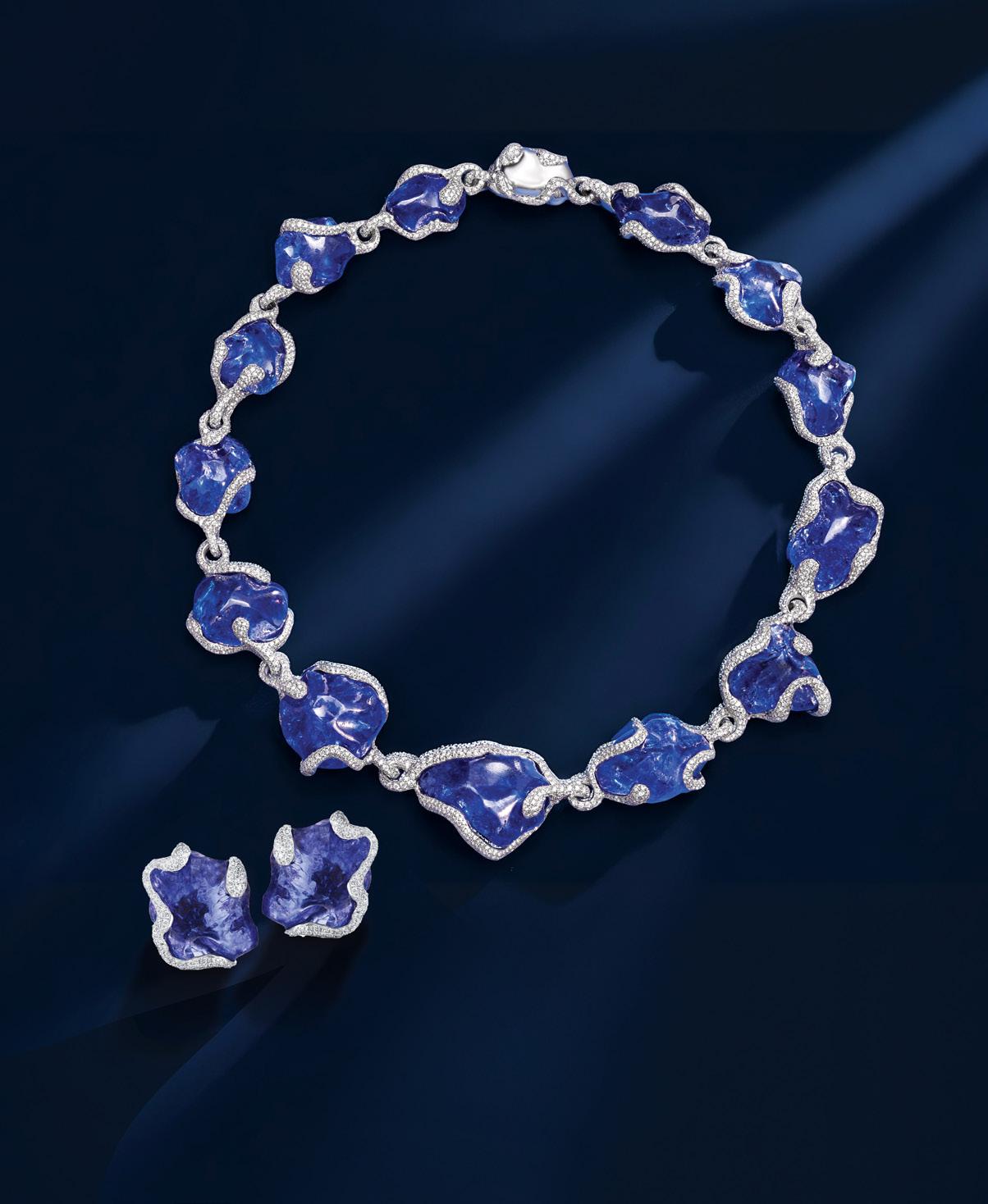 Tanzanite necklace and earrings, set in white gold and micro pave white diamonds