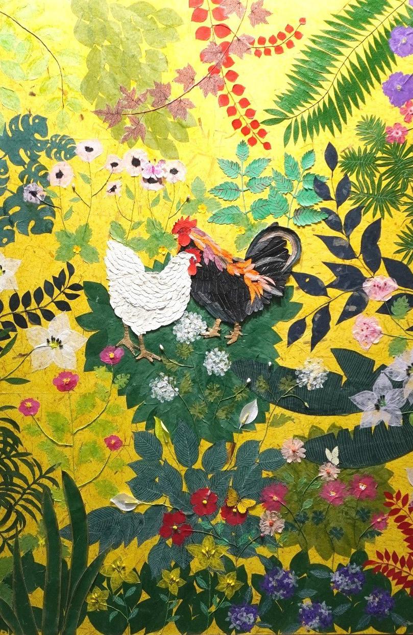 Jinny Suh’s work is rooted in nature—particularly chickens, birds, and butterflies— and uses these symbols to explore themes of freedom, elegance, and human connection. Through the use of Korean Hanji (traditional paper) and vibrant traditional Korean colors, her artwork reinterprets time-honored values for modern viewers, bringing warmth and emotional resonance to the often cold, urban spaces of today’s world.