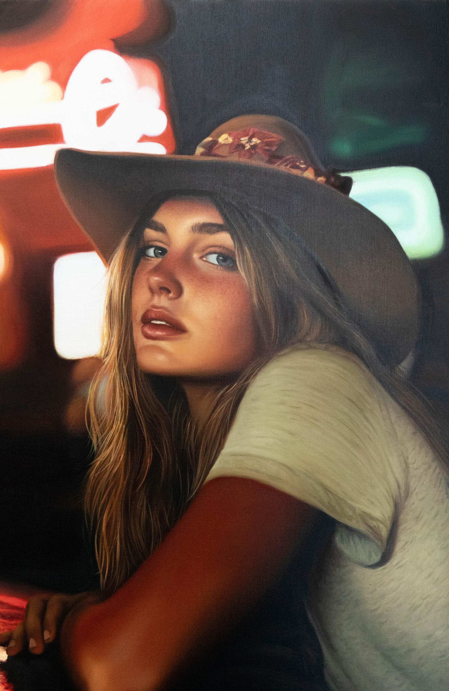 Ozeri presents a selection of portraits of women situated in diverse environments: the bustling streets, the glow of diners, and the serenity of natural landscapes. These works reveal his ability to balance specificity with universality – the individuality of each sitter is rendered with extraordinary detail, yet the scenes feel both familiar and dreamlike. Alongsidethese portraits, Ozeri showcases interior scenes from classic diners, the textured charm of London streets, and sweeping vistas of nature, each painted with his signature devotion to atmosphere and mood.
