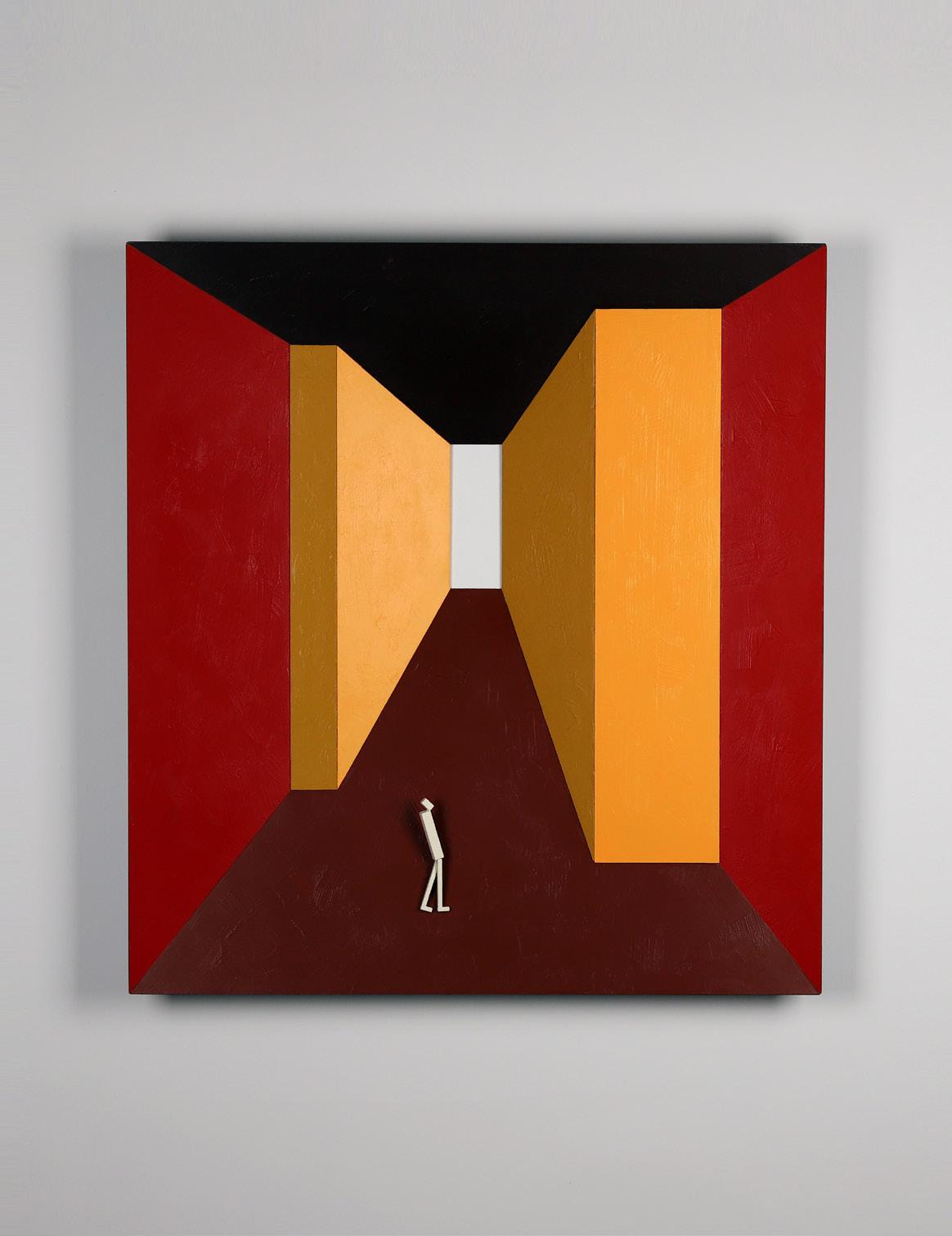 The square-shaped spaces in Mun Min’s work function as more than just structural motifs; they symbolize the framework that defines and regulates human existence and social order. Within these constructed boundaries, individuals are assigned standardized identities and drift between anonymity and individuality.
