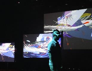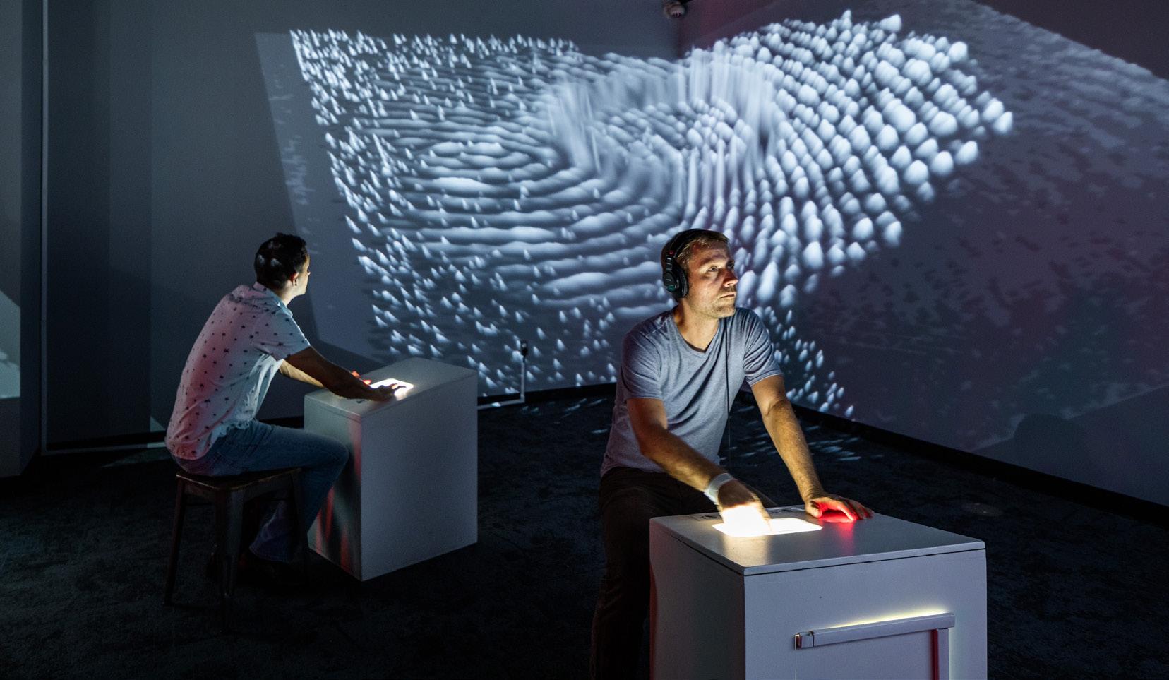 Within the physical environment but also visible through the headsets, visitors also encounter a series of large and small animated projections. The projections are the result of a live computer program which merges physical and virtual paintings and relays a fluid travelogue through an endless evolution of imagery. The two screens offer dual views of the same route marked by painting landmarks, but one view is a forward motion while the other is a reverse. While each individual has a personalized experience within their own headset, they can see other visitors also wearing a headset and moving through their own unique path. Participants simultaneously experience a communal space while sectioned away from each other, akin to virtual meetings and online interactions.