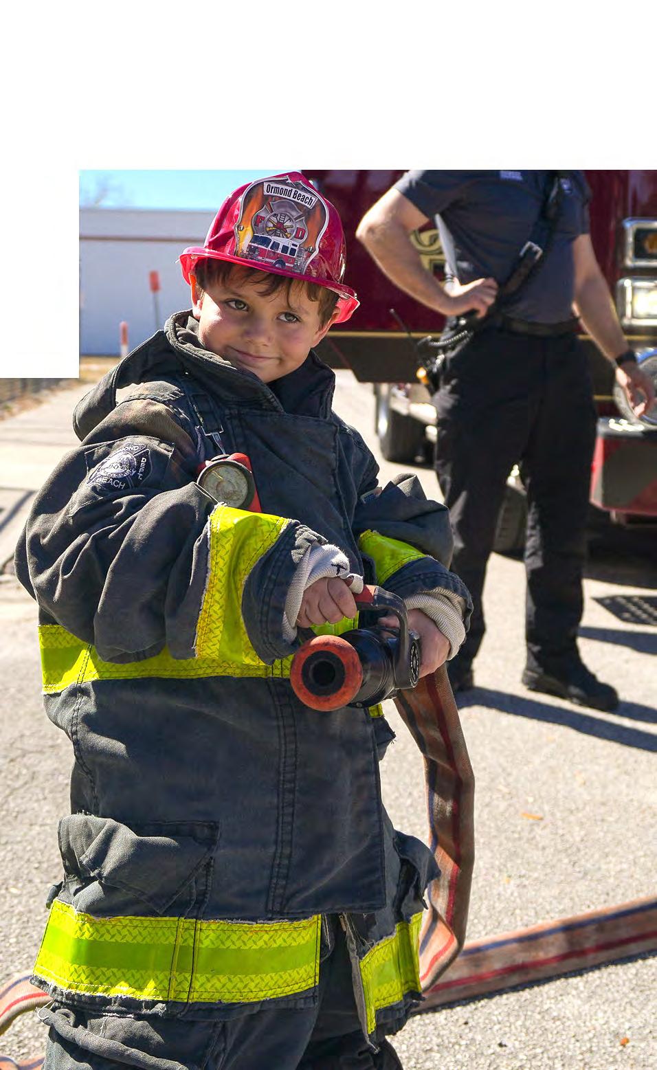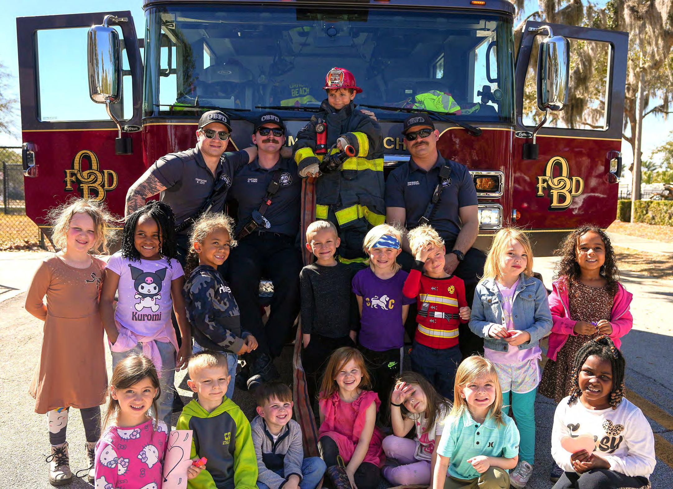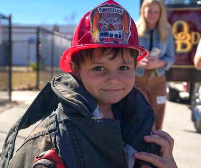 During OBFD’s visit, Austin got a chance to sit in the captain’s seat inside the firetruck and try on a firefighter’s uniform.