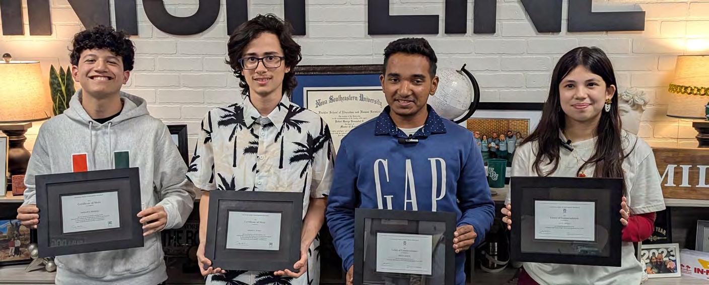 Giant black letters affixed to the wall behind them read, “THERE IS NO FINISH LINE.” For these students, achievement is a daily quest. Adniel Alonso and Mitchell Spencer Edelstein have been selected as National Merit Scholar Finalists. They are among about 15,000 finalists nationwide. Syed Haider and Ava Mello just missed out on becoming Merit Scholarship semifinalists and were named National Merit Commended Scholars.