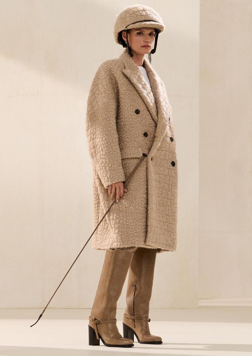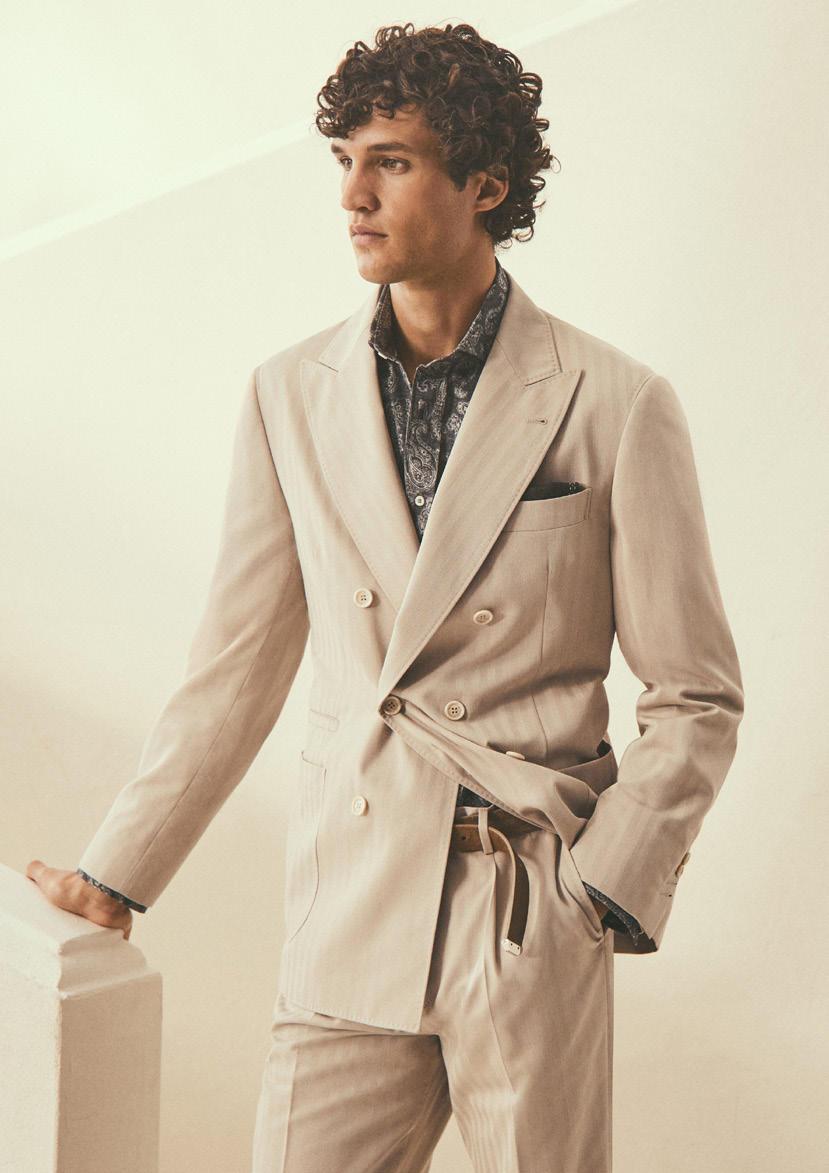 ou tendências, mas para longevidade — na construçãoenarelevância.Sãoconcebidos para salas de reuniões, negociações, chegadas tardias e vitórias silenciosas. Tal como os homens que os usam, são feitos para a continuidade e não para o espetáculo. A inovaçãonaBrioniédiscreta,quaseinvisível. Técnicas modernas aperfeiçoam precisão, ajuste e conforto, sem nunca perturbar a tradição. A mão humana permanece essencial — guiando, ajustando, aperfeiçoando.Esteequilíbrioentreprogressoeherança garante que cada peça seja contemporânea sem parecer passageira.