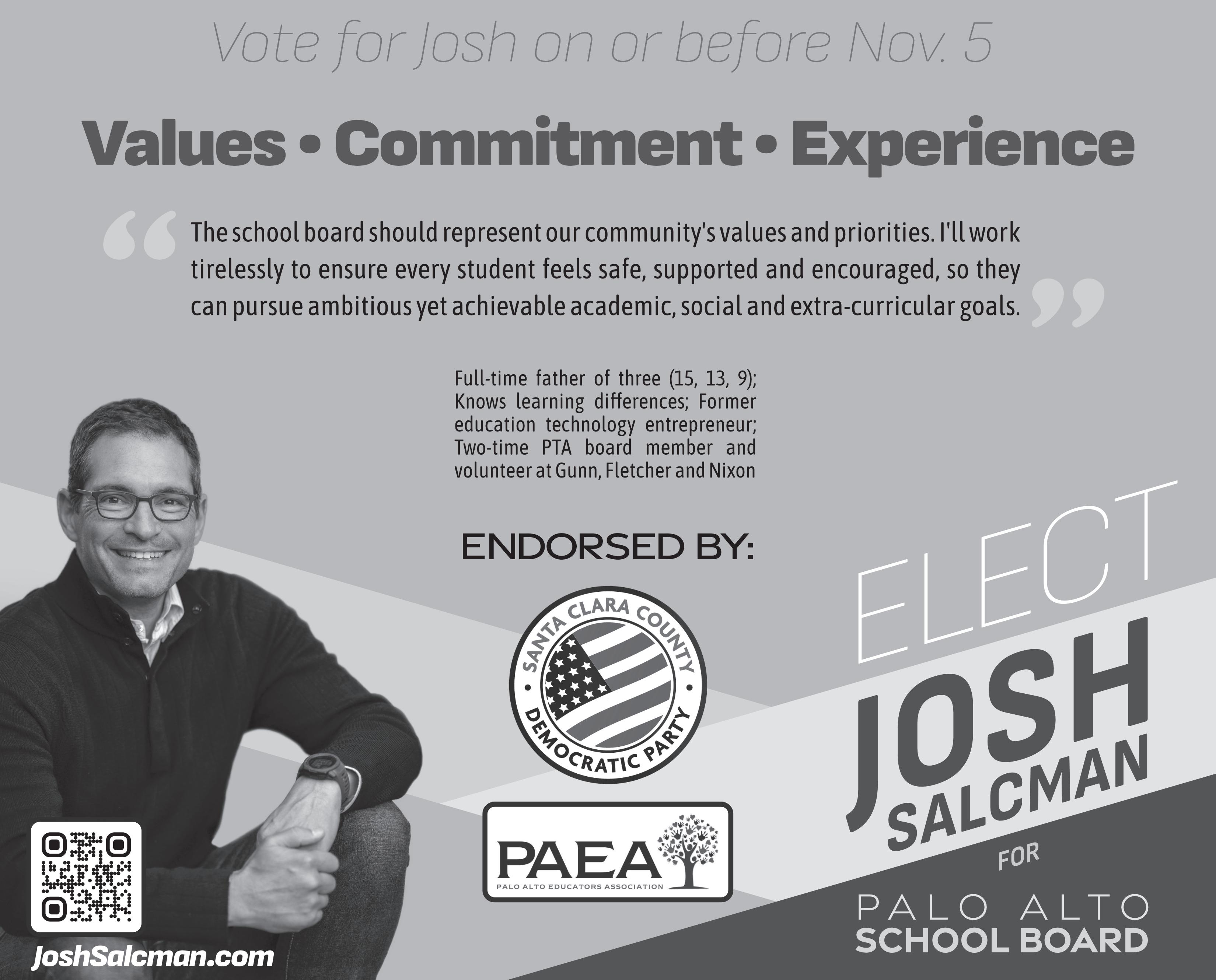Five candidates are running to ll three seats on the Palo Alto Board of Education in the Nov. 5 election. Rowena Chiu, Nicole Chiu-Wang, Chris Colohan, Alison Kamhi and Josh Salcman are campaigning to occupy the seats currently held by board president Jesse Ladomirak and trustees Jennifer DiBrienza and Todd Collins. e school board meets semimonthly, with each meeting following a preset agenda and typically holding an open forum for community members to speak about their concerns.