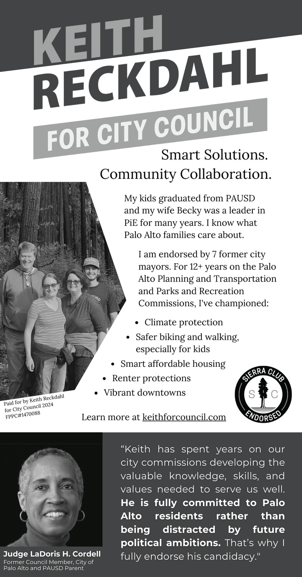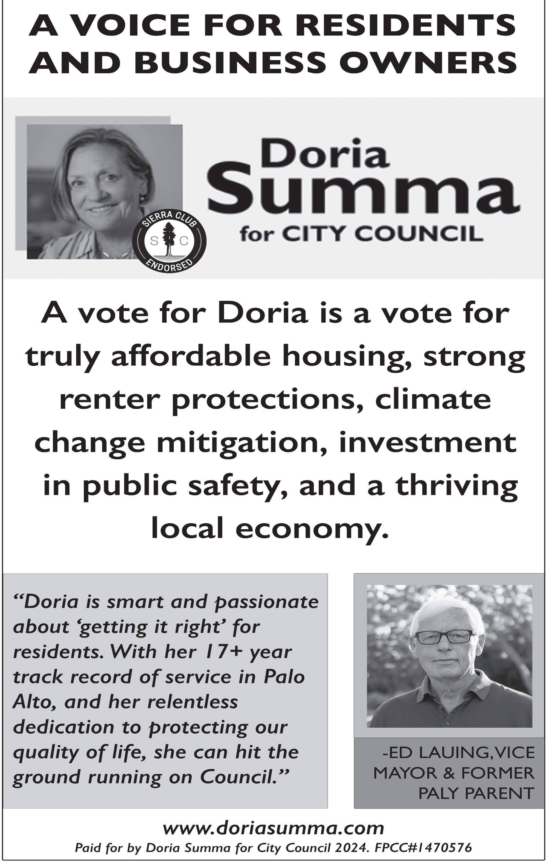 As a prior member of the PAUSD Ad Hoc Child Care Committee, Kamhi’s campaign has three main principles. e rst concept is the idea of safety, starting with preventing gun violence, increasing bike safety, providing mental health resources, advocating for special needs and eliminating hate speech. Her second campaign principle is providing opportunities for every student to excel and be successful. Kamhi’s last principle and highest priority is building mutual trust within our community.