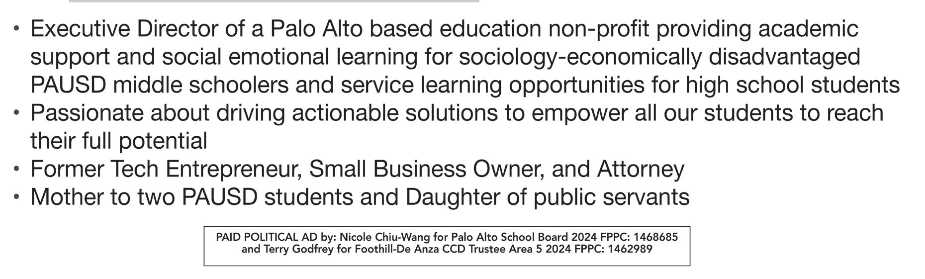 Chiu is a Palo Alto Uni ed School District parent and former Ohlone Elementary School Parent Teacher Association president who has lived in Palo Alto for 15 years. Chiu said she is committed to addressing the concerns of parents with children in special education and mental health programs.
