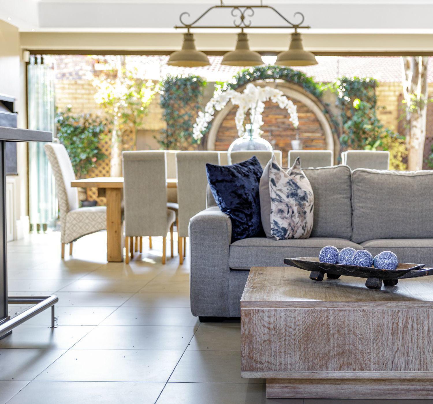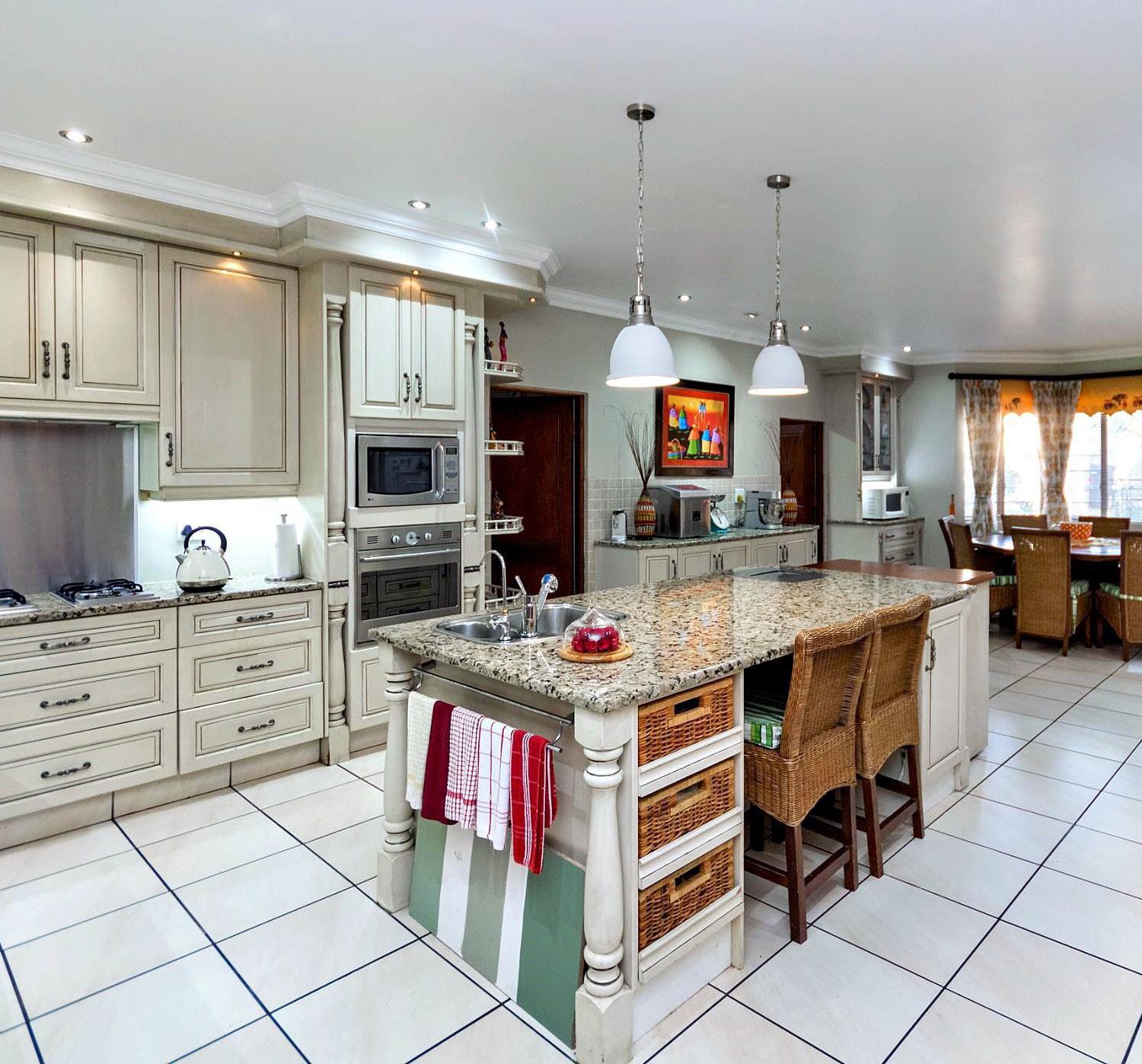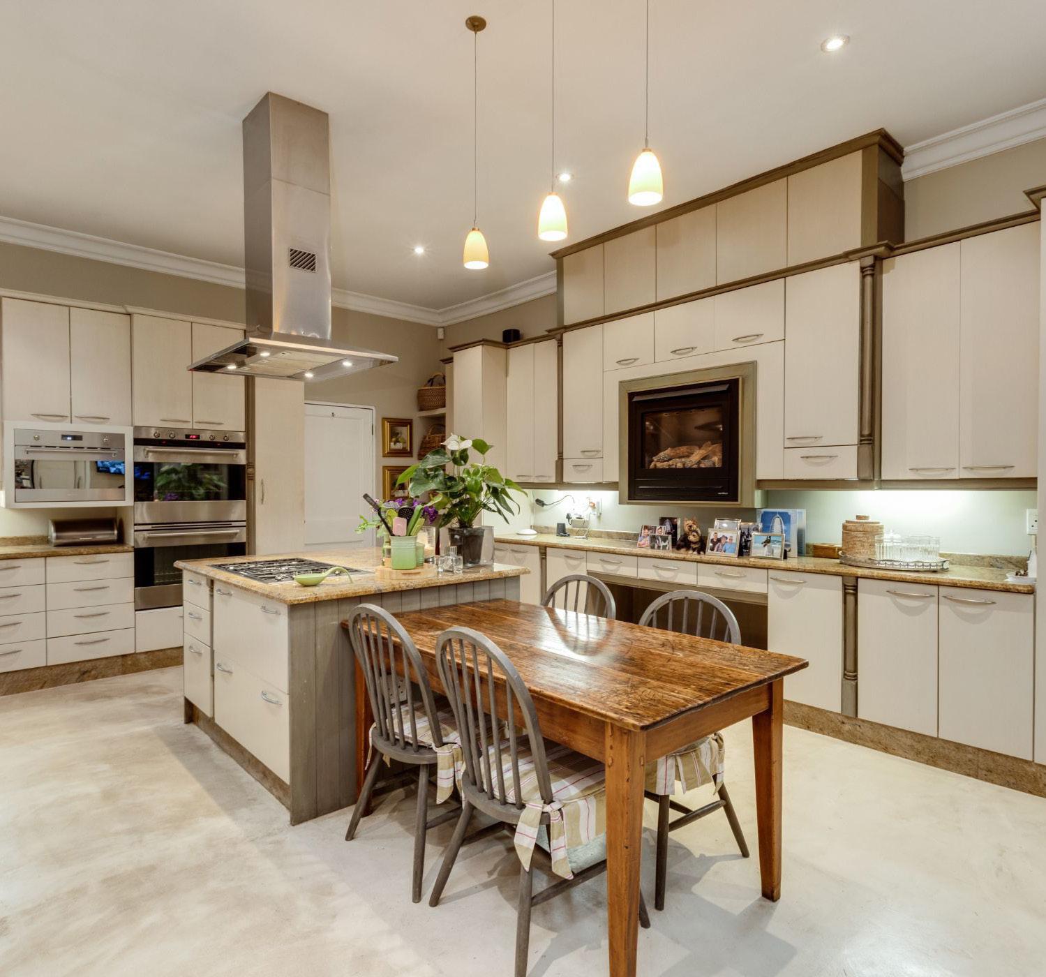Classic and elegant cluster designed for a relaxed lifestyle, looking for a growing family. Entrance hall with an amazing granite staircase filled with sunshine from the skylight above, a Formal lounge with doors out to the garden, and a Gas fireplace. Sunny family room with fitted bar area, gas fireplace, doors out to patios, pool, and manicured garden. Open-plan fully fitted kitchen with breakfast bar leads to the dining area, Sep. scullery, Study/guest bedroom and Guest toilet.