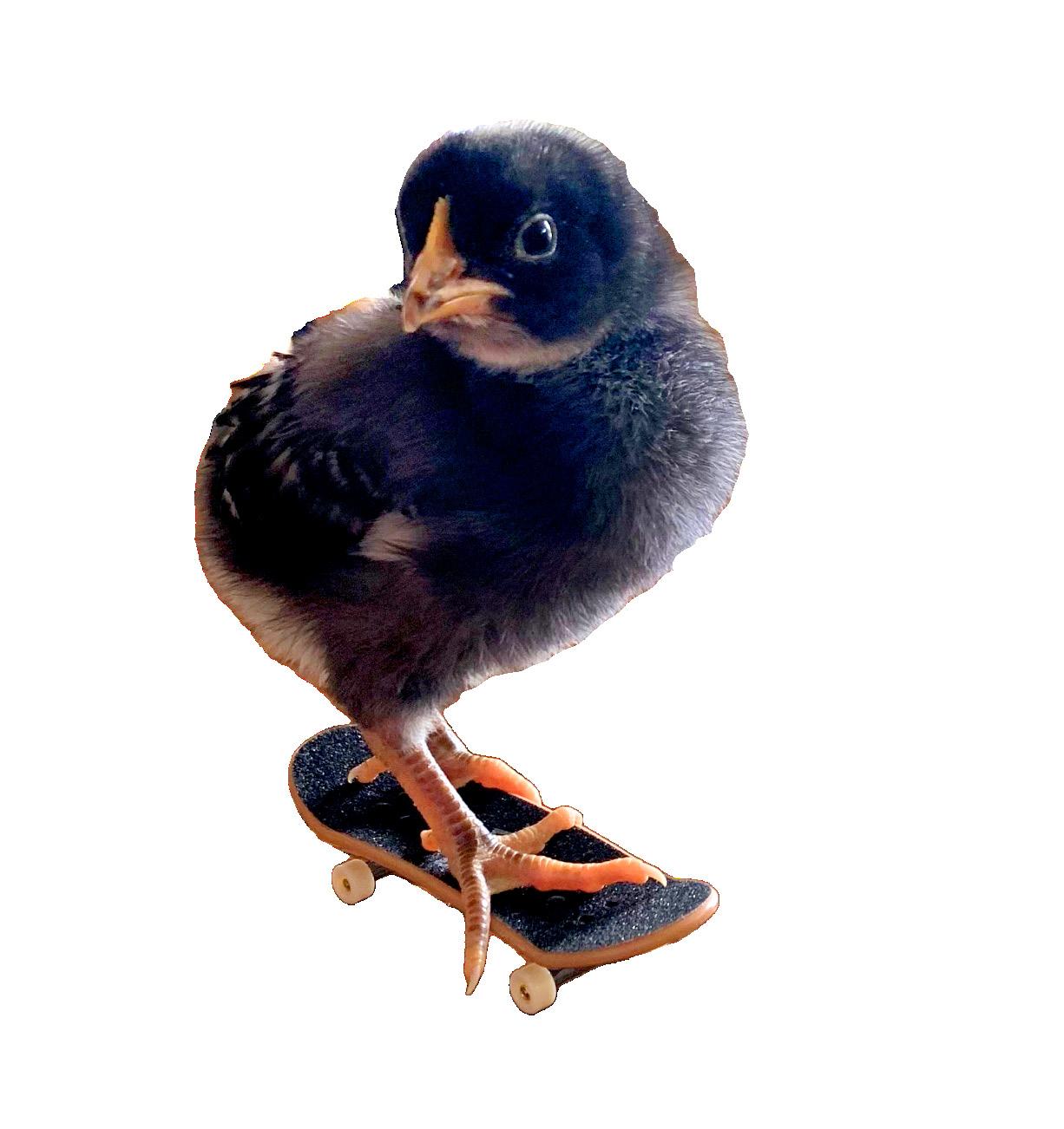 ‘They see her rollin’; they hatin’ “Jolene is a Barred Rock hen. She was about 5-7 days old in that pic. I got her at Tractor Supply. I could put her on the skateboard and push her around on it. She loved it. I have other chickens named for the golden girls: Dorothy, Rose, Blanche and Sophia.”