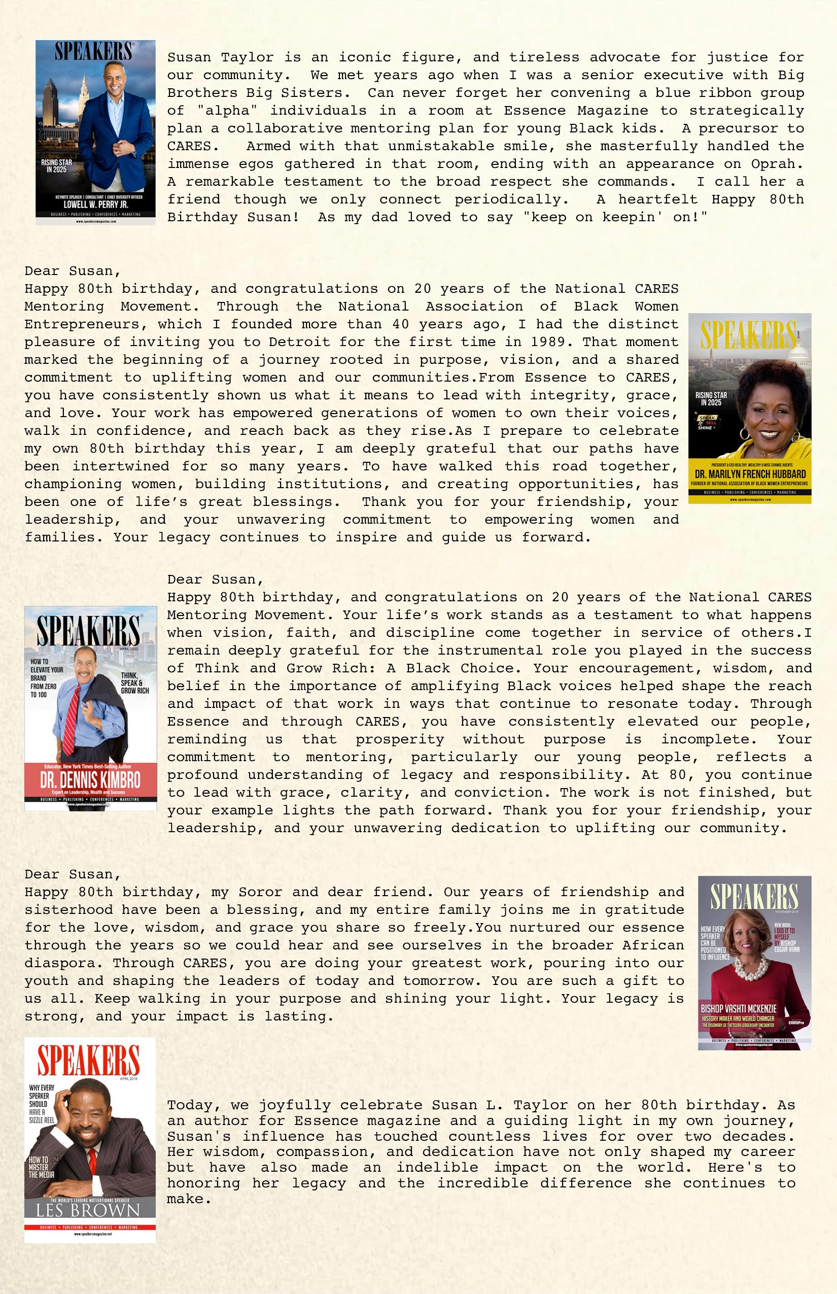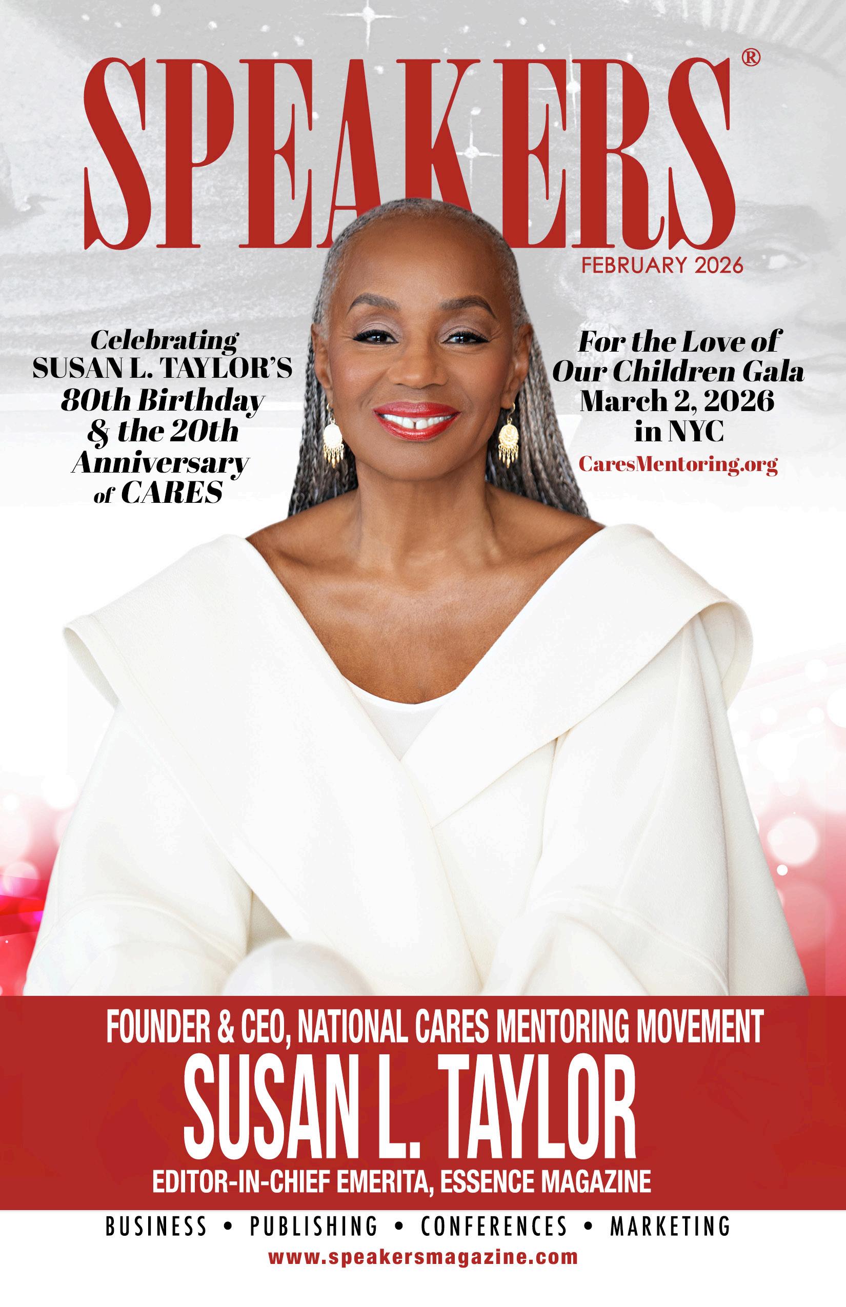 The February 2026 issue of Speakers Magazine celebrates legacy, leadership, and the power of voice. This special edition honors Susan L. Taylor, Founder and CEO of the National CARES Mentoring Movement and Editor-in-Chief Emerita of Essence Magazine, recognizing her 80th birthday and the 20th anniversary of National CARES.