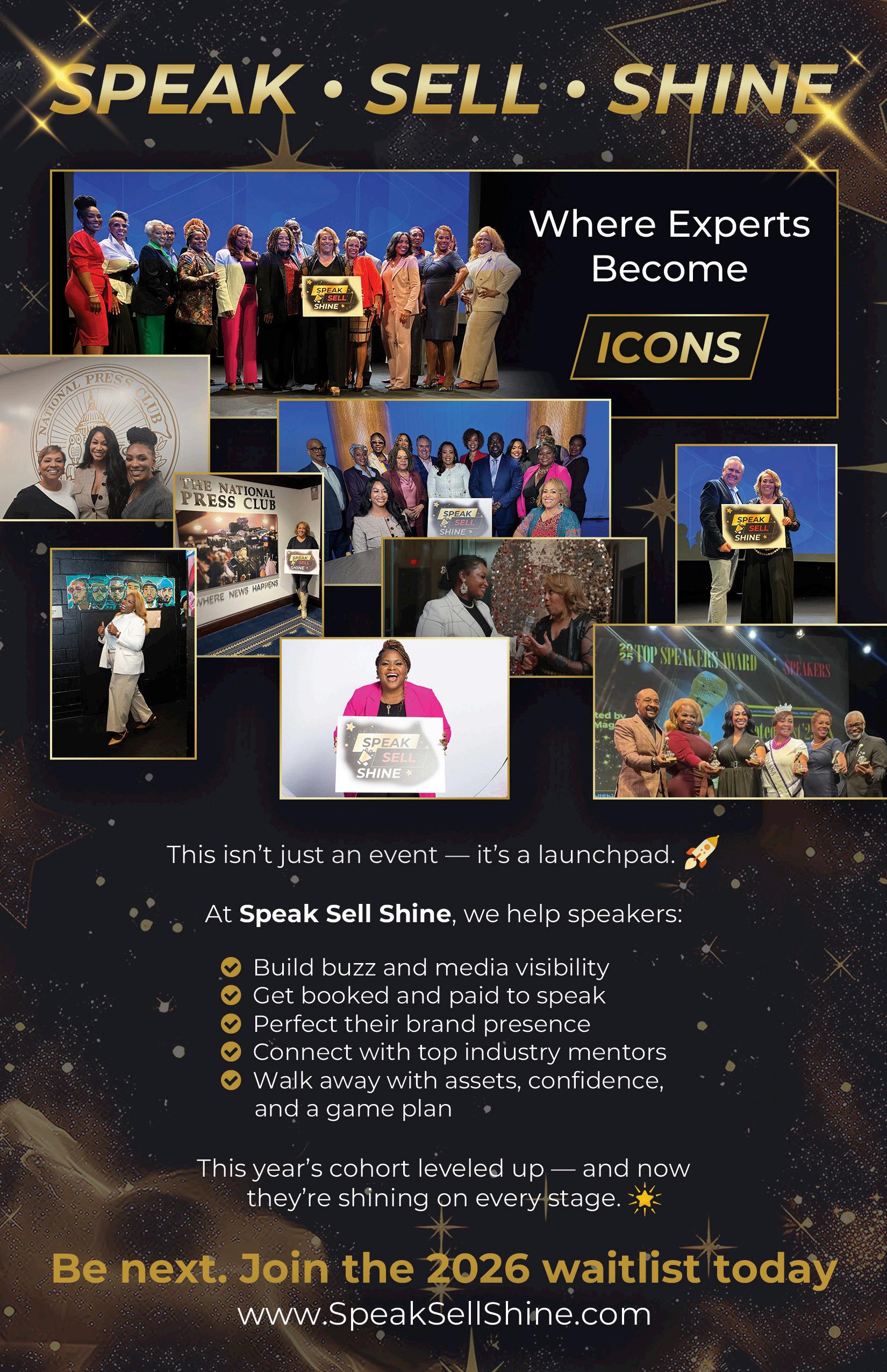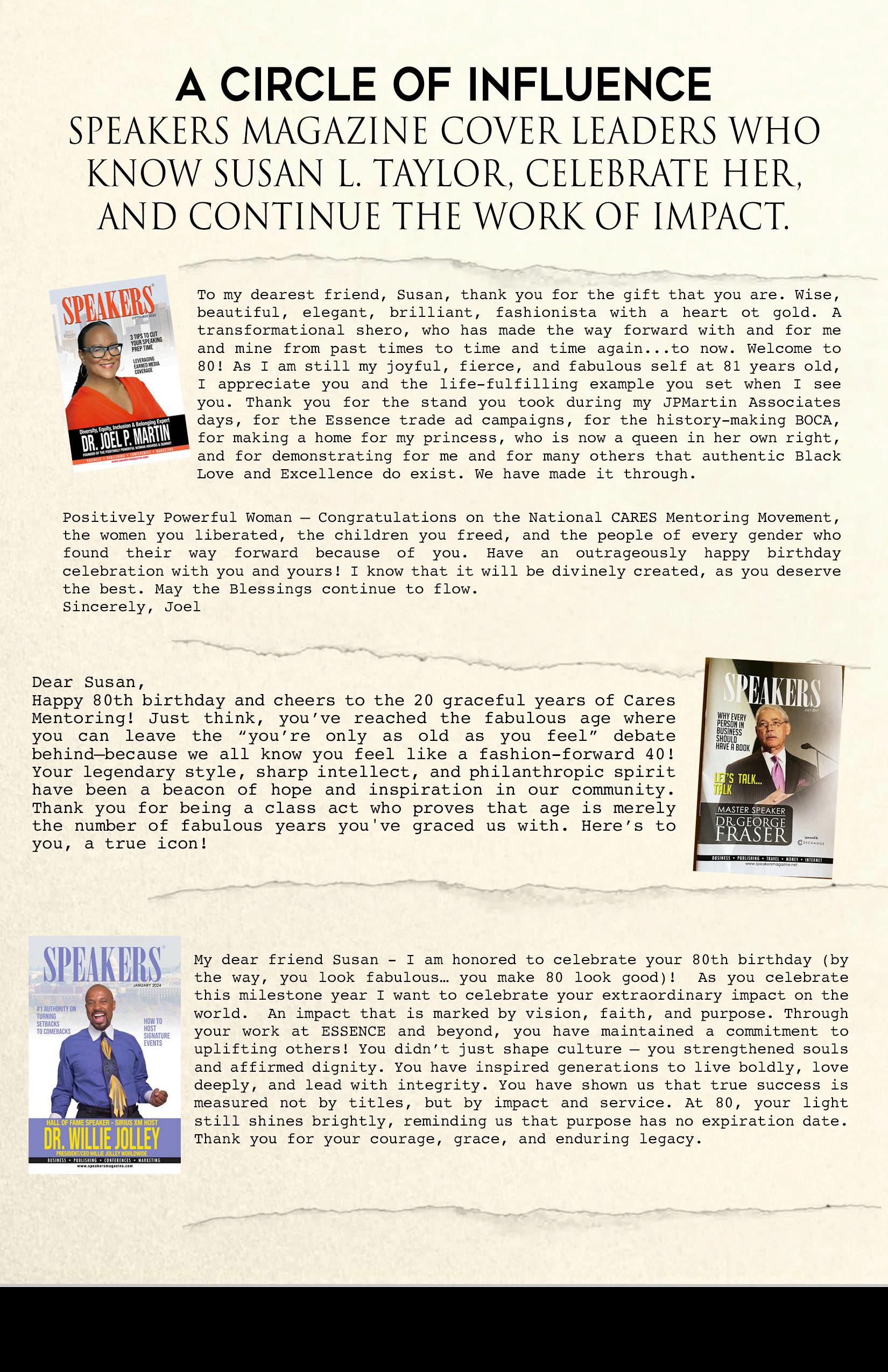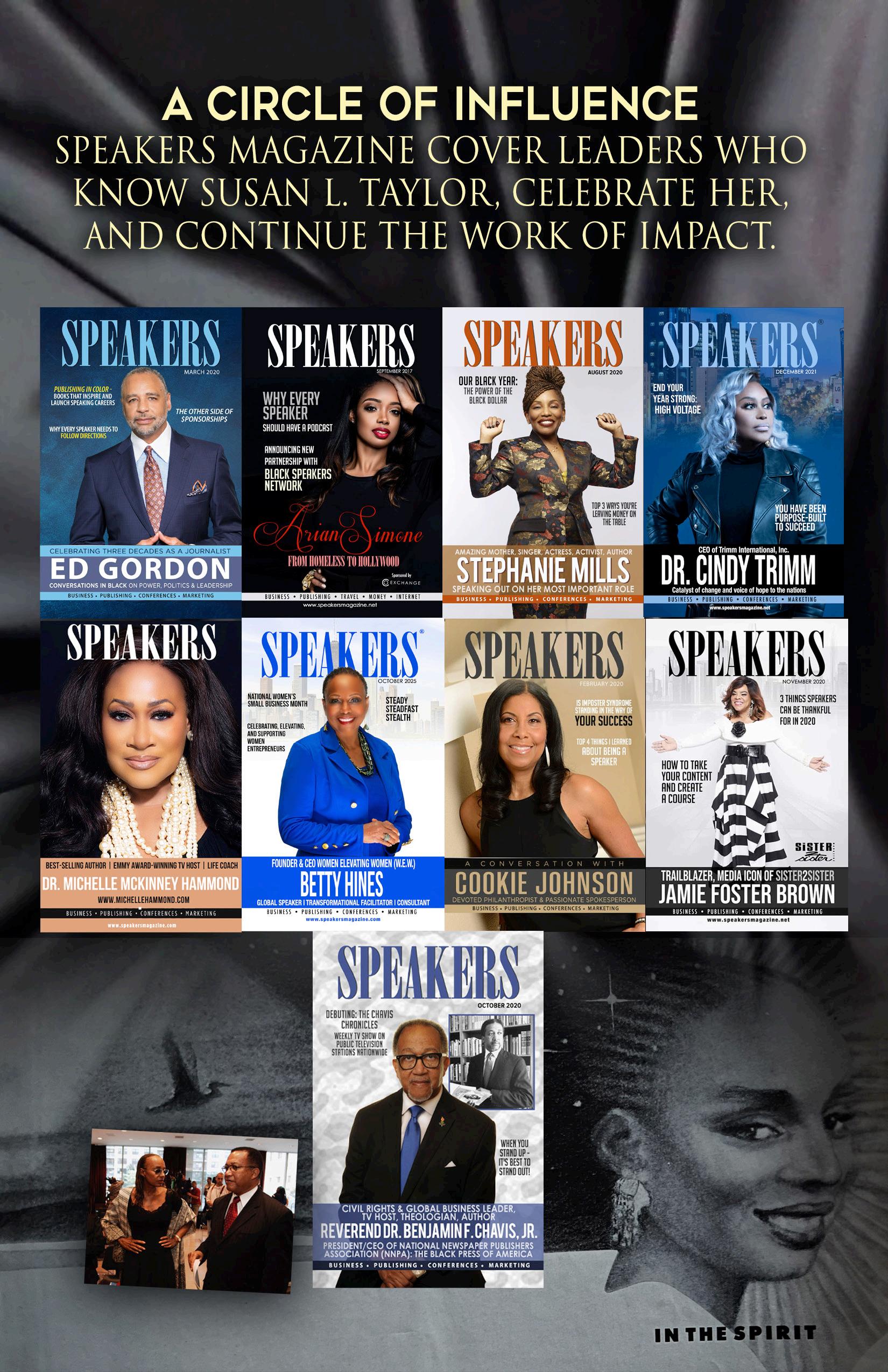 This issue is a tribute to impact. It features a compelling cover story on Susan L. Taylor’s lifelong commitment to mentoring, media, and service, along with reflections from leaders, speakers, and changemakers whose lives and work have been shaped by her influence. A special Circle of Influence showcases Speakers Magazine cover leaders who continue the work of impact through speaking, leadership, and advocacy.