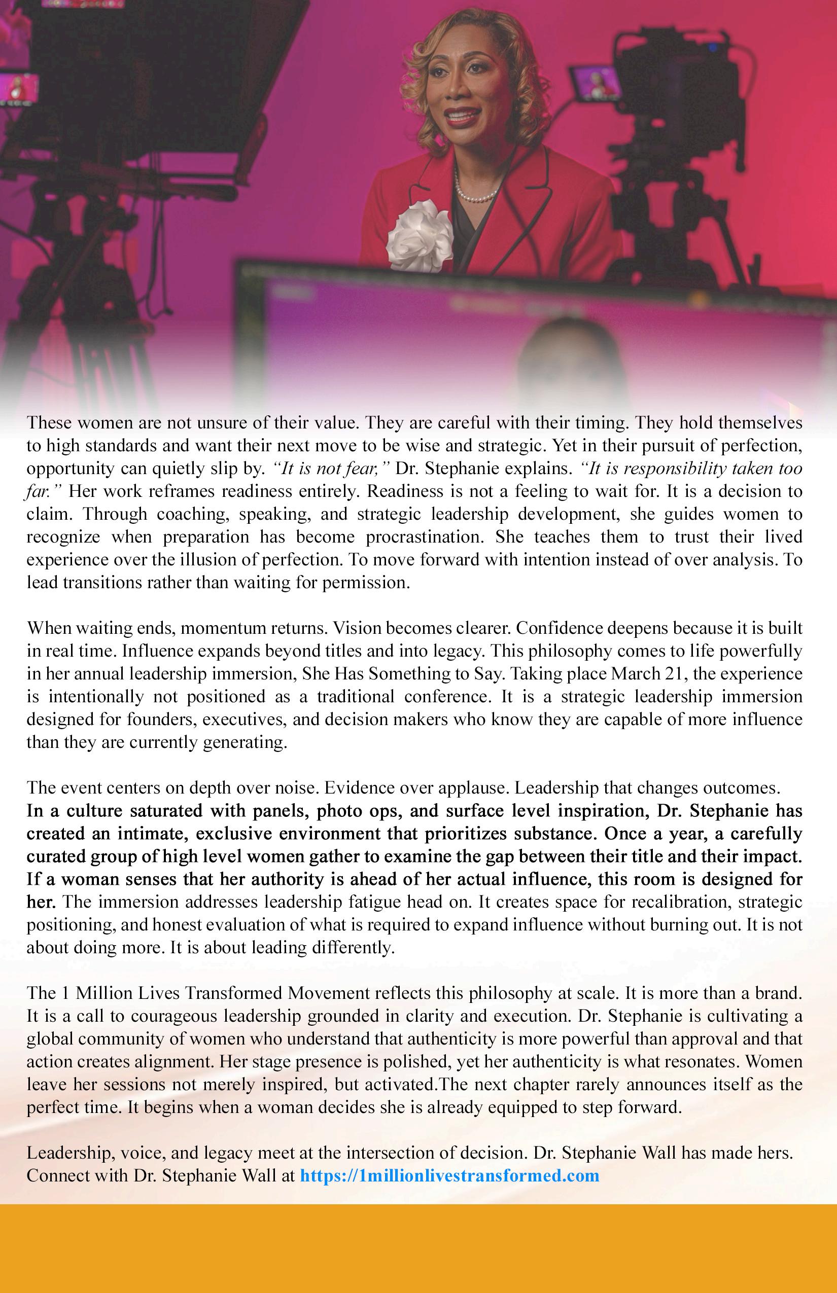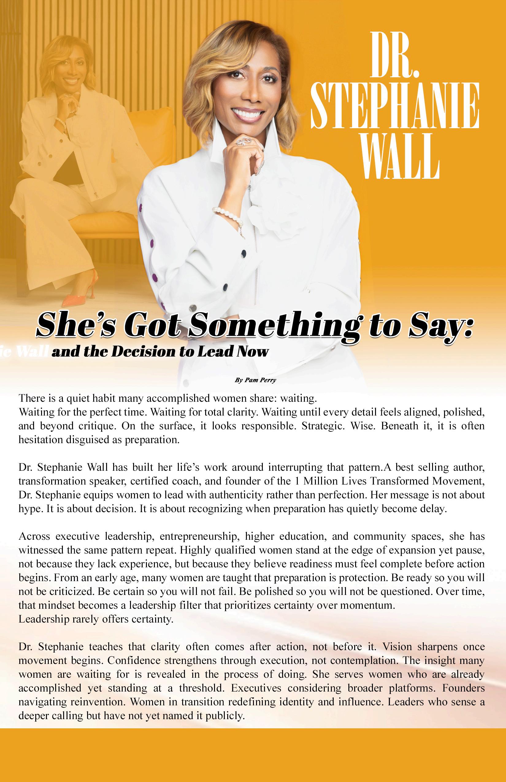 On the cover is Dr. Stephanie Wall, founder of the 1 Million Lives Transformed movement and host of the “She’s Got Something to Say” conference. Her feature story highlights decisive leadership, confidence in action, and what it truly means to step into visibility with purpose.