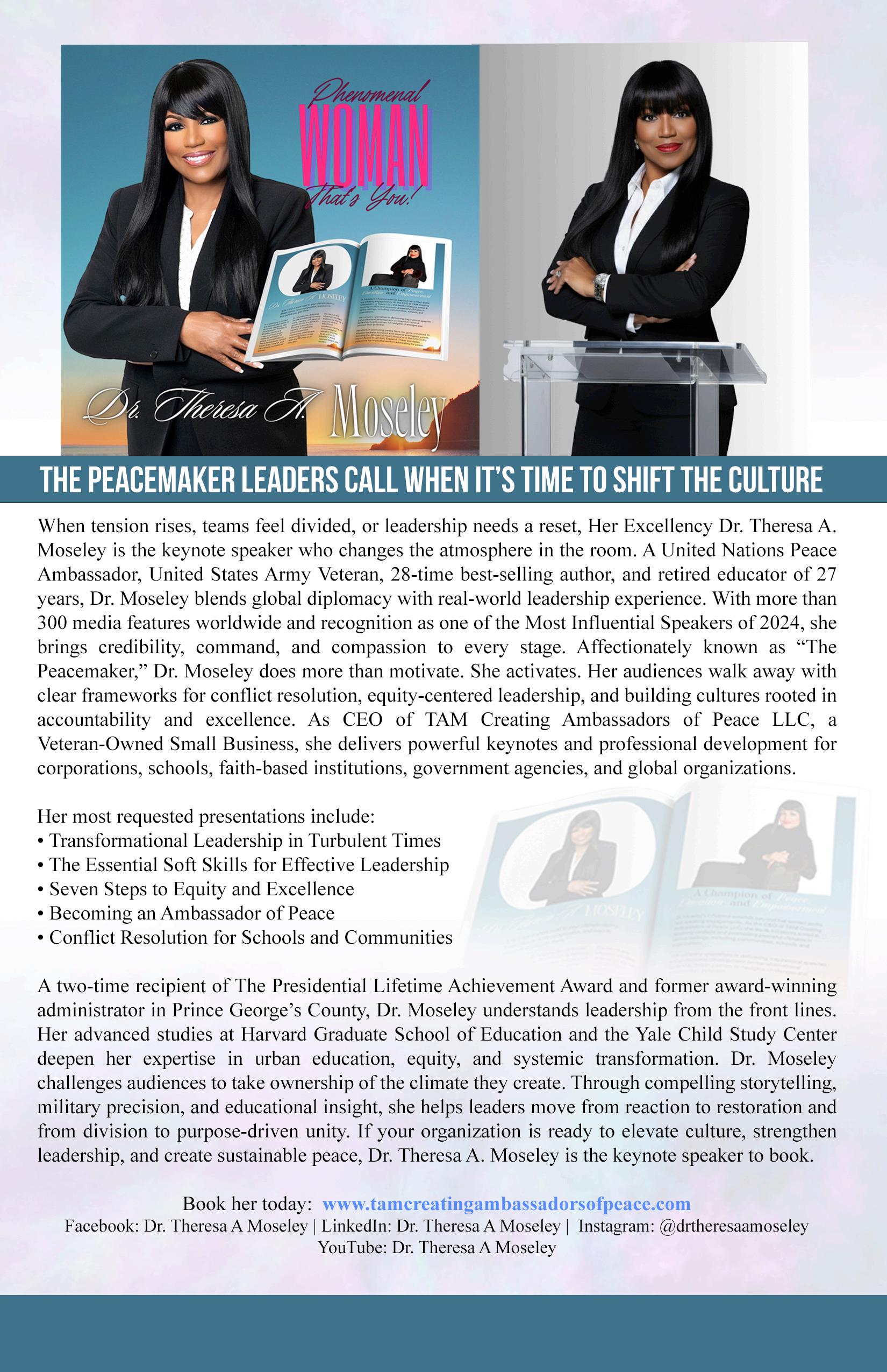 Dr. Theresa A. Moseley, a global peace ambassador and leadership expert helping organizations transform culture.