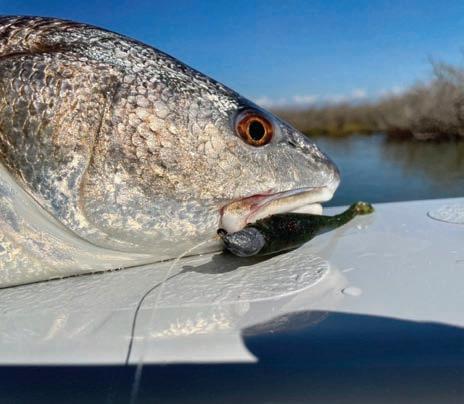 Like most people who work on the coastal waters while making a living, Randall looks forward to the shorter, cooler days of fall. “I love the fishing this time of year. As autumn progresses, the bait and the game fish all begin to migrate out of the backwater areas, headed toward the pass, and eventually into the Gulf. When they do, the fishing is often easy, sometimes around working birds. We do well with topwaters this time of year on a daily basis. One of my favorites is a black/gold/orange Skitter Walk. I’ll also throw the white one at times, especially if I see a bunch of ribbonfish around. Of course, slow-sinking twitchbaits work great this time of year too, especially when they’re worked over a muddy bottom with some shell scattered around on the calmer days after fronts blow through. During the toughest bite days, we do best throwing soft plastics like Norton Sand Eels and working them fast overall, with spastic action, trying to trigger reaction strikes. In this scenario, when we’re often fishing out of the boat in water too deep to wade, I prefer a natural colored lure like tequila gold rigged on a three-eighths ounce jighead.”