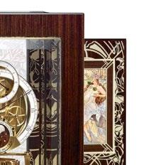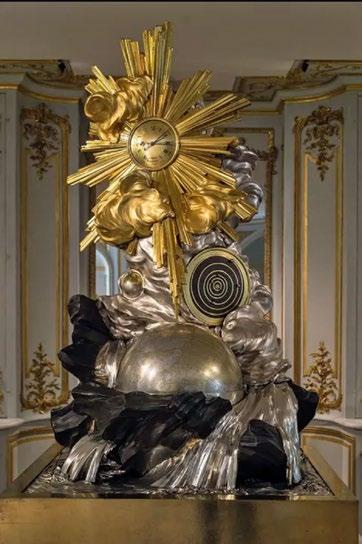 Rather than prioritising calendars or astronomical data, it situates the passing of hours within a broader, almost metaphysical narrative - turning plates to show planetary positions around the sun, moon phases, and constellation maps on a globe which rotates. It showcases time as an echo of the universe’s genesis.