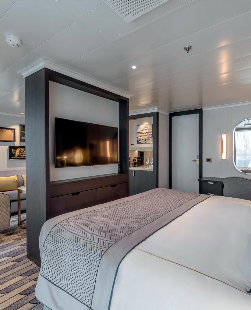 Equally urbane, just slightly smaller, are the 34 Penthouse Suites (Q3 and Q4 grades), which span between 532sq ft and 647sq ft. The 25 Queen Suites (Q5 and Q6 grades) measure 507sq ft up to 577sq ft. In all Queens Grill suites, butler service is available to streamline and personalise guests’ needs.