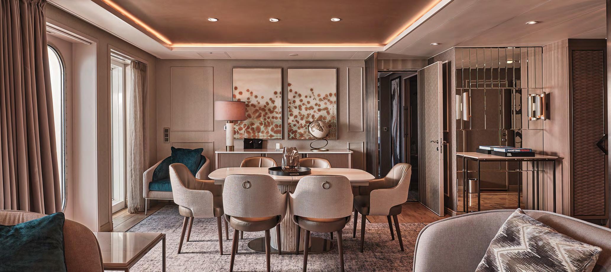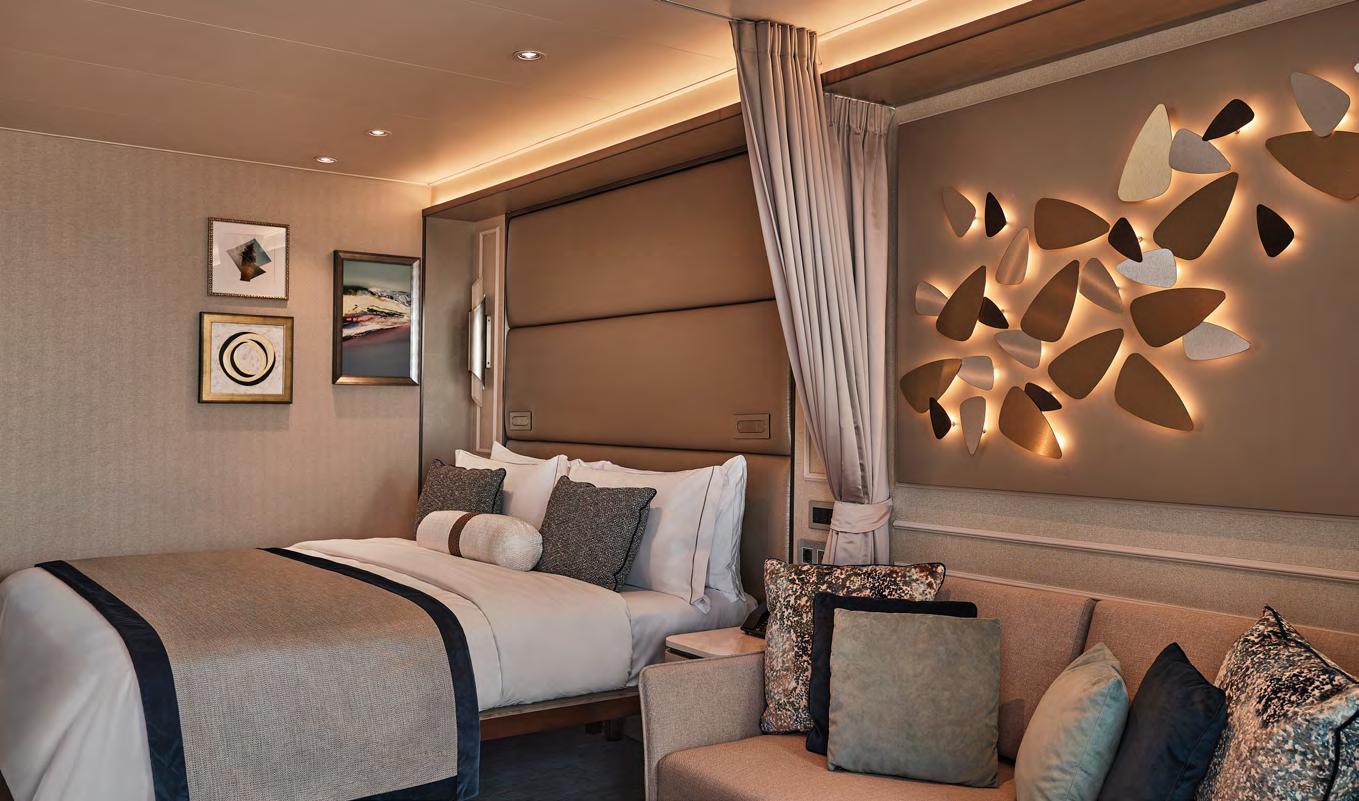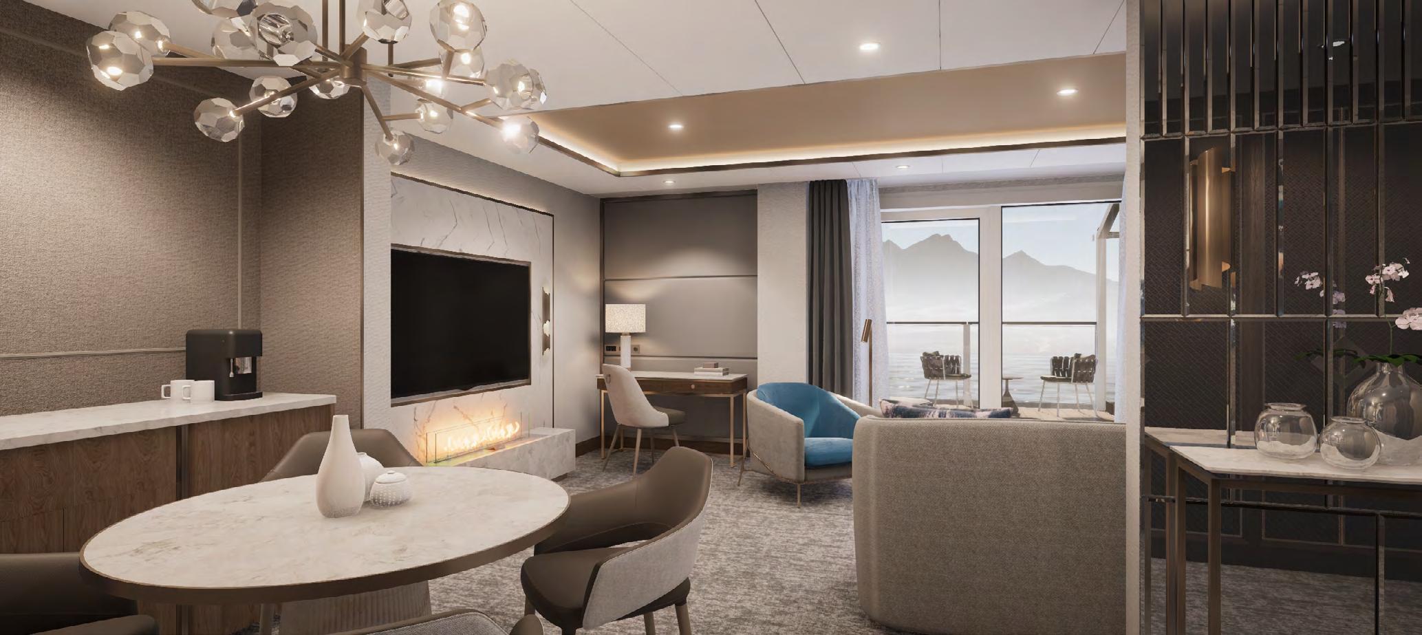 The Master Suite offers complete destination immersion at sea. Floor-to-ceiling windows plus domed glazing and one of the largest balconies on board provide wow-factor 270˚ views, while the spacious living and dining areas, separate bedroom and bathroom with walk in shower and whirlpool bath ensure complete in-suite comfort.