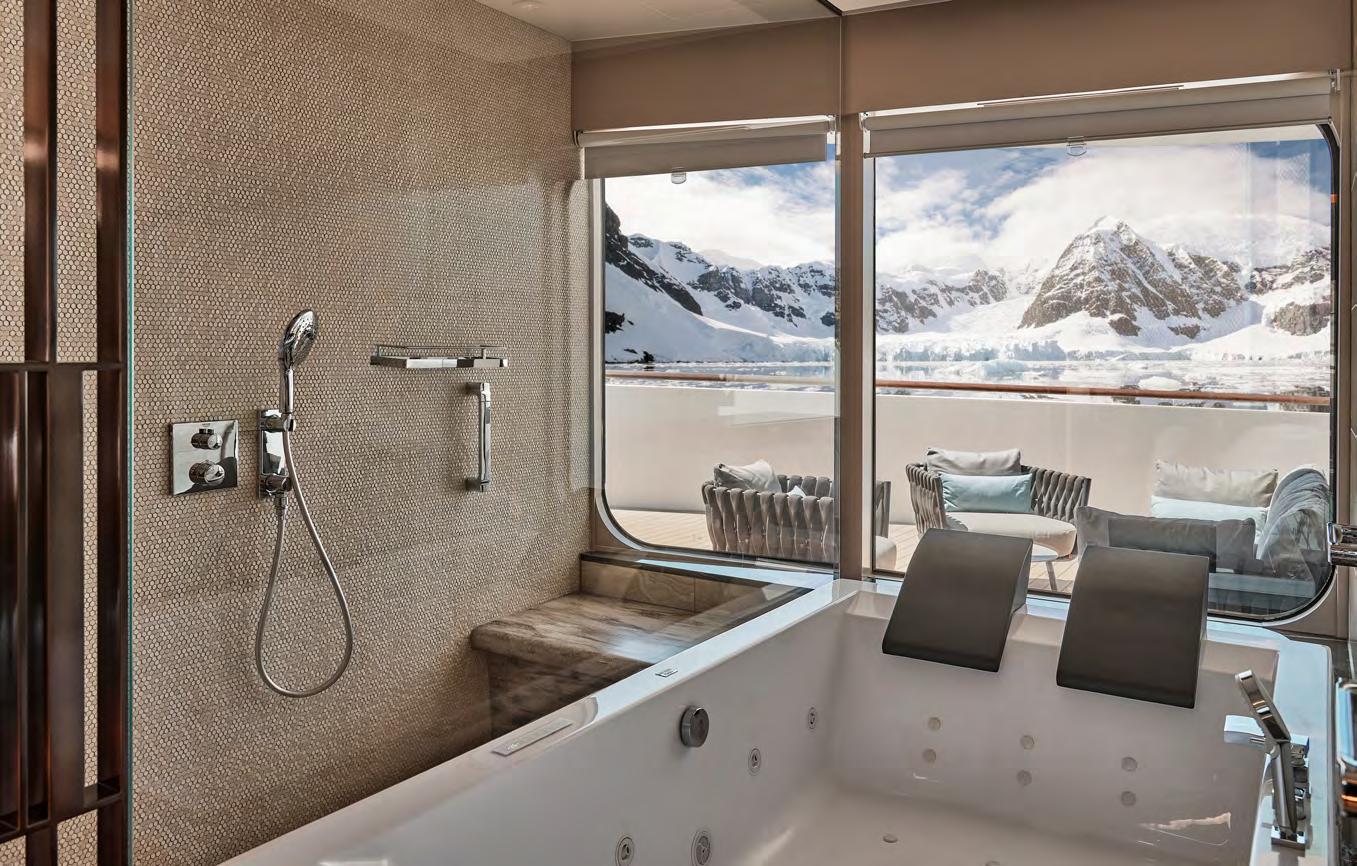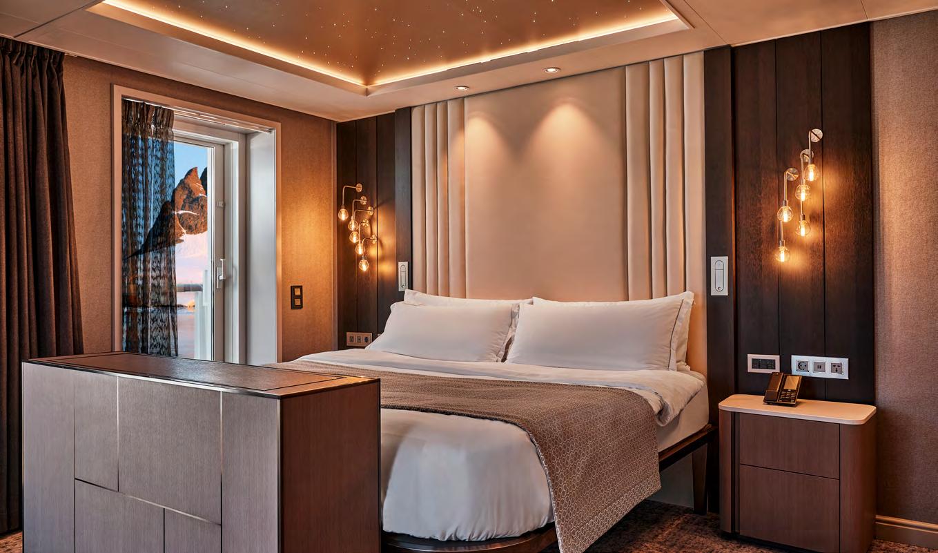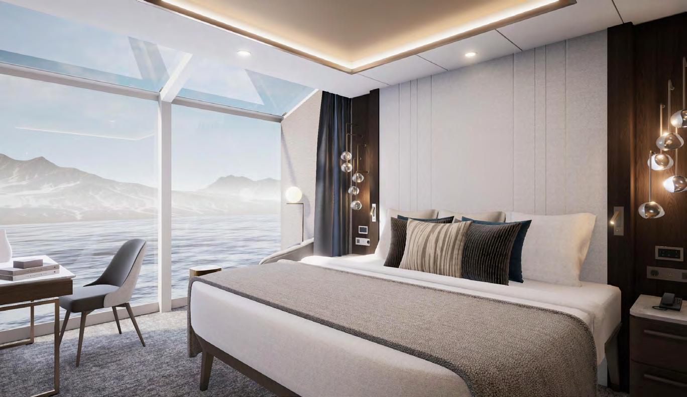 feature a spacious private balcony and floor-to-ceiling glass windows for an unobstructed connection with each destination. Sophisticated interiors are well appointed with all the amenities needed for expedition cruising as well as a bevy of indulgent luxuries to create an elegant retreat following extraordinary adventures ashore.