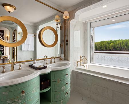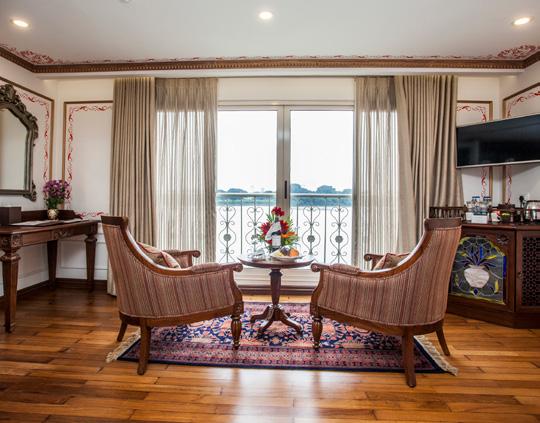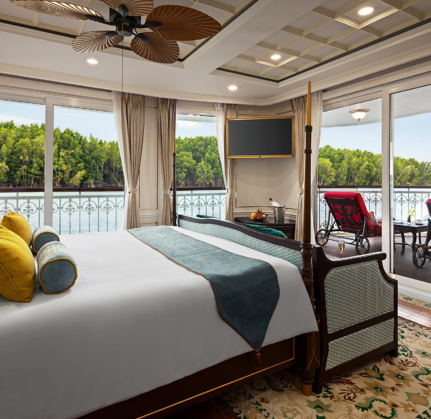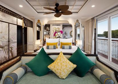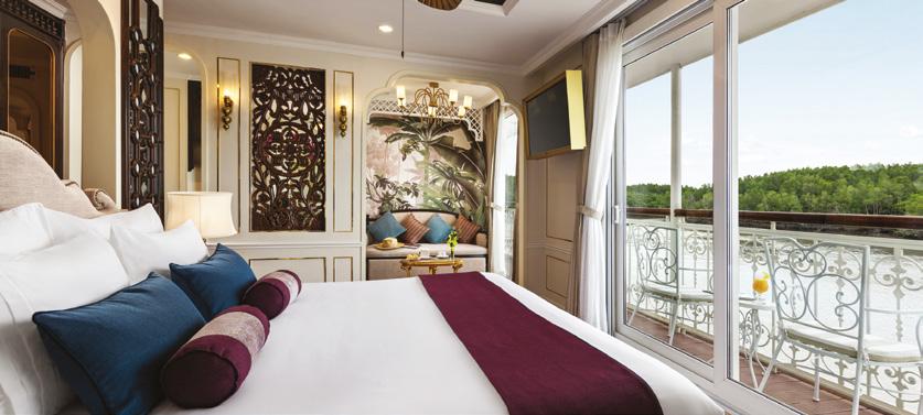 The ship’s spacious, high-ceilinged suites are a serene sanctuary, with beautiful hand-painted murals and all the comforts of a five-star hotel. All suites have a cosy sitting area and a French balcony with floor-to-ceiling glass doors. A bed dressed in soft linens, with a choice of pillows. Your roomy bathroom has a rain shower, comfy robes and slippers, and spa-quality bath products. Other high-end amenities include a generous amount of closet space, under-bed storage, a flat-screen television with a wide selection of on-demand movies, individual climate control, bottled water replenished daily, fresh fruit and flowers upon arrival, makeup mirrors and universal electrical plugs.