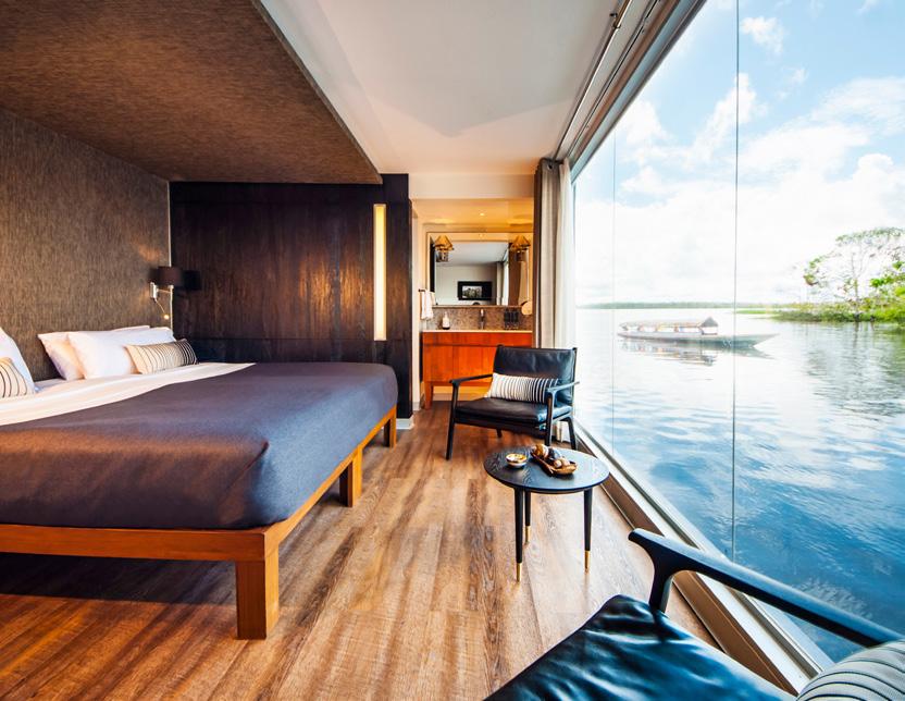 Designed to explore the heart of the Peruvian Amazon in luxury and comfort, the Aria Amazon is an all-suite ship with floor-to-ceiling windows, giving you a full view of the majestic rivers and rainforest. The top deck features a jacuzzi, indoor lounge & bar and an outdoor observation deck.