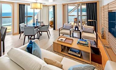 Ocean-view, two-room suite that is 80% larger than Nordic Junior Suites, with private Nordic Balcony, private veranda, separate dining area for 4, additional storage and seating features, plus private access to Explorer Suites Garden.