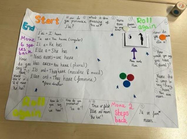 In French, the P7 classes are learning the verb ‘avoir’(to have). It is a very important verb in French and the students learnt how to conjugate the whole verb in the present tense. They were introduced to the verb via a song. The next step was to create a game that would revise the verb avoir. The students created snap games and a variety of board games, the most popular being a ‘spin off’ of the game Monopoly. Of course, they also had to include instructions for the games.They really enjoyed making the games and then playing each others’games. This way of learning is a great way to learn grammar. French verbs are very challenging as each subject pronoun has its own verb ending, something that is not seen in the English language. Next step will be writing in French using the different verb forms, in the singular and plural. Well done P7!