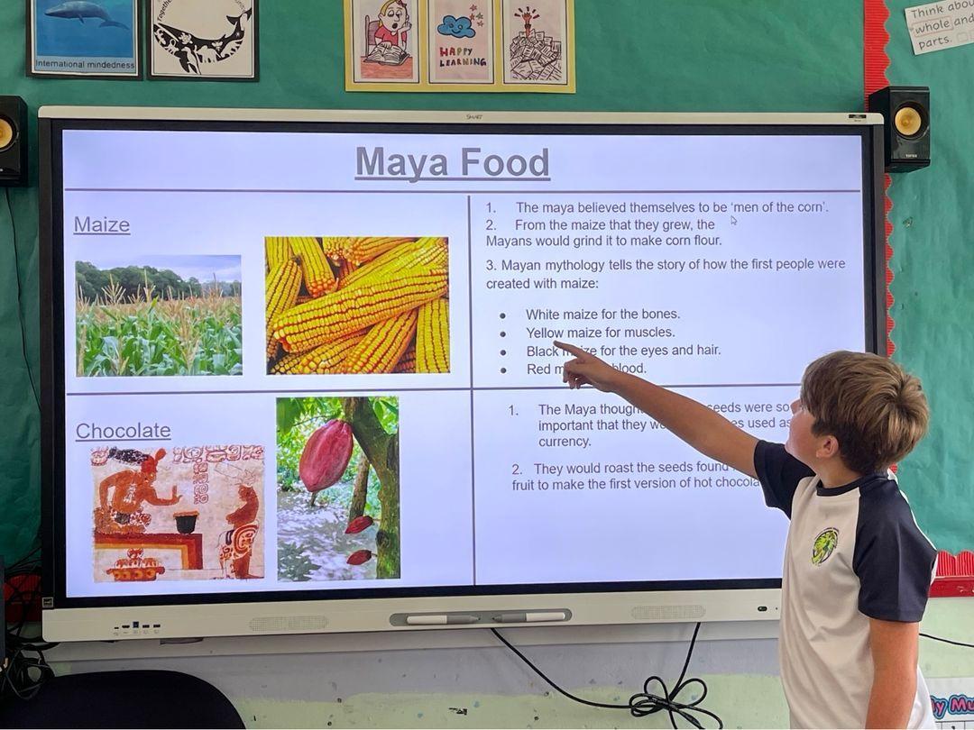 The children researched Mayan food before creating and sharing presentations about it. They also researched Mayan religious practices and historical sites.