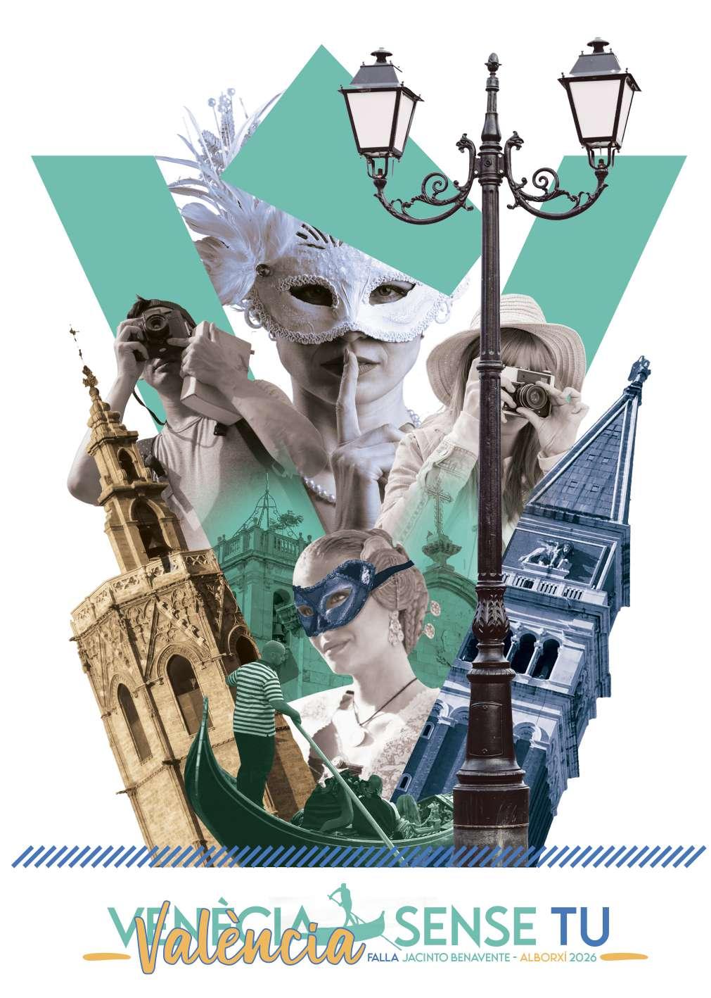 València sense tu és el títol del llibre d’enguany, i encara que puga semblar bucòlic i romàntic, no ho és. Quan ens van comentar l’esbós de la falla adulta i vam fer una tempesta d’idees per a unir la seua temàtica amb el contingut del llibre, ens va vindre a la ment aquella cançó que deia: ““Qué callada quietud, qué tristeza sin ti, qué distinta Venecia si me faltas tú”. L’autor de la lletra havia de trobar a Venècia molt sola si no estava la seua estimada en ella, però parlem de la mateixa Venècia on, res més trepitjar-la, trobes una ciutat impossible de recórrer per l’excés de turisme. Una ciutat que s’afona, ja no sols perquè els seus fonaments no poden retindre-la, sinó perquè és una de tantes ciutats on ja no viuen veïns i veïnes, sol turisme que arriba i es va sense importar-li gens ni mica el final de la història. Va València pel mateix camí? Possiblement.
