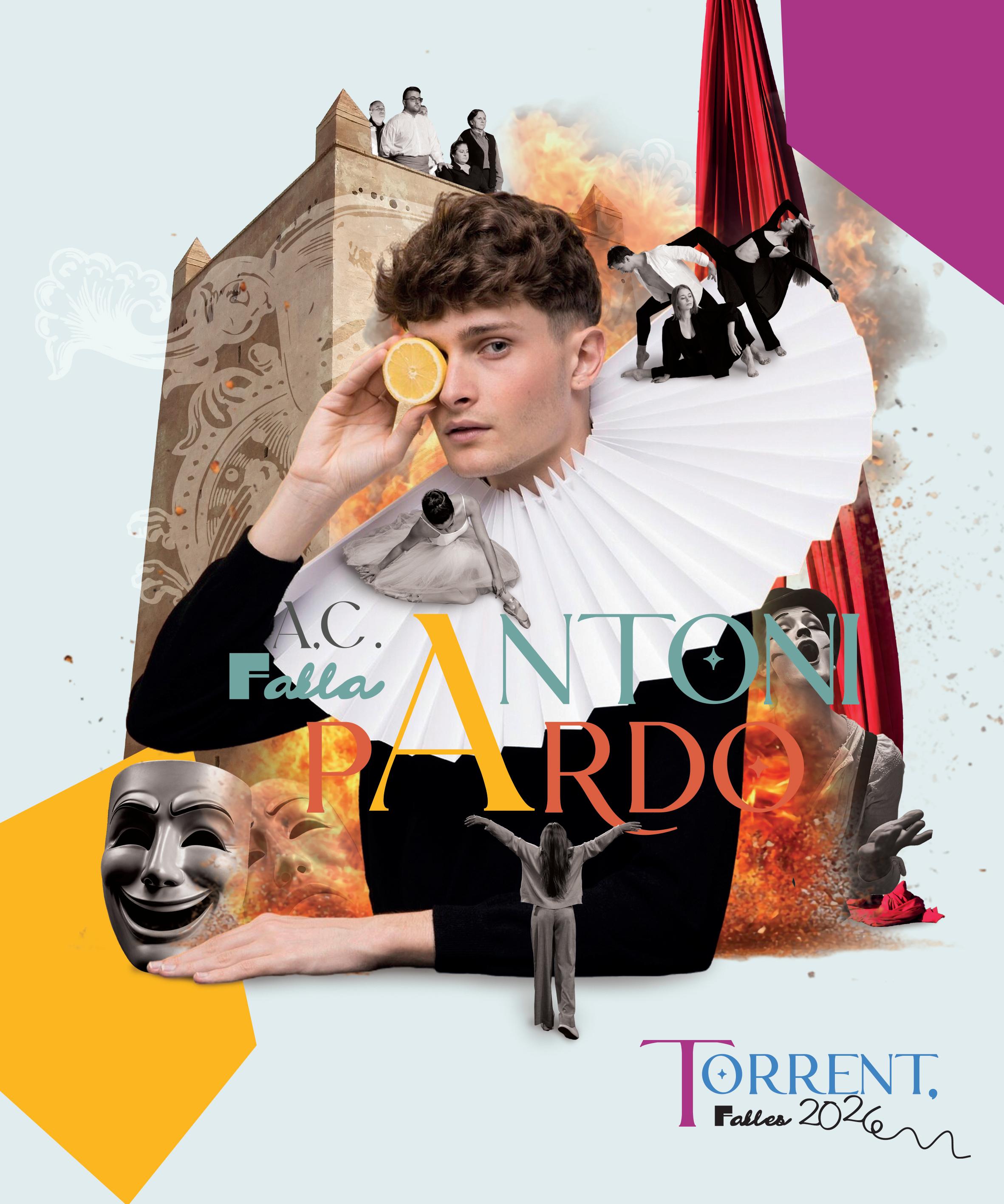 Amb tècnica collage, s’ha creat una falla, un cadafal sobre una figura cervantina que subjecta una taronja, símbol d’aquesta terra. Al seu voltant, formes i figures teatrals i falleres, i d’ací, d’aquesta localitat. Quan es dissenya el guió d’un llibre faller, igual que el d’una obra de teatre, s’imagina un escenari i una escenografia concorde a la qualitat artística. Potser eixe ha sigut la nostra comesa: donar imatge a una fantàstica labor de redacció i estudi, aquesta imprescindible peça - teatral - de la cultura festiva valenciana.