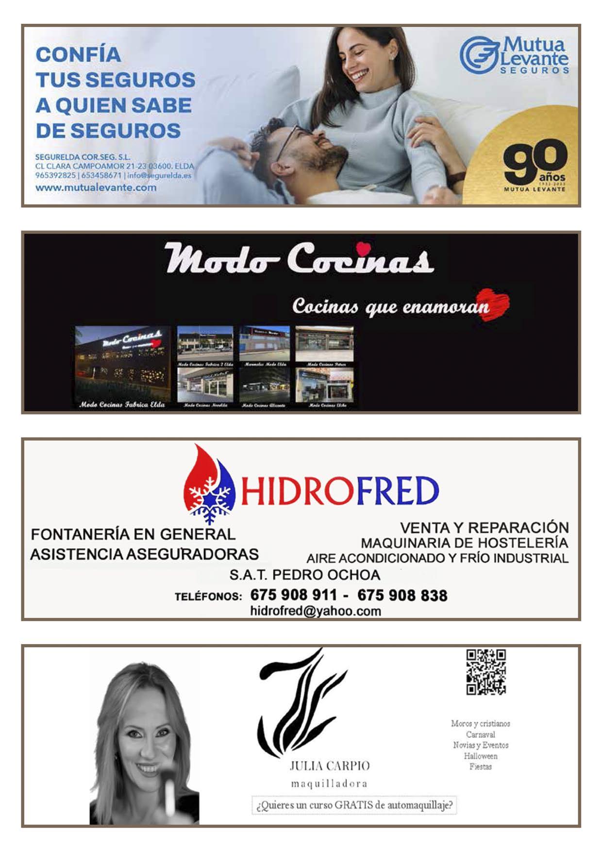 Edita, Nuestra Portada................................................................pág 2 Saluda del Alcalde de Elda, y Saluda del Concejal de Fiestas..............................................pág 3 Saludas de les Falleras Mayores de Elda...............................pág 4 Saluda de la Presidenta de JCF Elda y Saluda Presidente de la Mayordomía de San Crispín y San Crispiniano...............................................pág 5 Saluda de Nuestros Presidentes...............................................pág 7 Crónica Anual 2022 - 2023 ................................................pág 9 - 19 Presentación de Cargos...........................................................pág 20 Guión de Actos............................................................................pág 22 Damas de Honor y Madrina de Honor pág 23 Fallera Mayor...............................................................................pág 24 Fallera Mayor Infantil..................................................................pág 25 Boceto Adulto.............................................................................pág 26 Boceto Infantil.............................................................................pág 27 Comisión Infantil..........................................................................pág 28 Comisión Adulta..........................................................................pág 29 Pregón Medio Año Fallero.......................................................pág 30 Artículos de colaboradores.....................................................pág 33