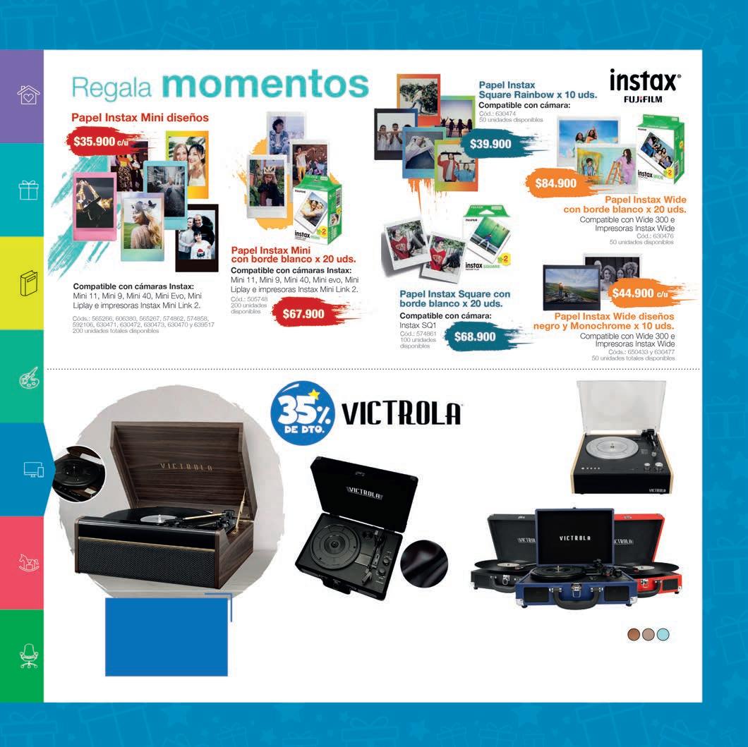 64 WWW.PANAMERICANA.COM.CO Inventario sujeto a disponibilidad en los puntos de venta / Consulta las referencias disponibles, precios y sus características en cada punto de venta / Las fotografías no representan el tamaño real de los productos / Los elementos de ambientación no forman parte de los productos / Máximo 2 unidades de productos de tecnología y productos en promoción del mismo código y/o referencia por cliente, por cédula, por factura, por tienda, por evento, por dirección de envío y ventas a crédito / Los precios sin oferta publicados en esta página son precios de lista / Ofertas no acumulables con otras promociones TORNAMESA PORTÁTIL DE 2 X 3 W RMS BLUETOOTH CENTRO DE ENTRETENIMIENTO VICTROLA VTA-72 TORNAMESA PORTÁTIL DE 2 X 3 W RMS BLUETOOTH CON CUBIERTA DE TERCIOPELO Precio con dto.: $402.900 c/u PRECIO NORMAL: $619.900 c/u Códs.: 612087, 610082, 610084, 633325, 612086 y 610085 100 unidades totales disponibles Precio con dto.: $584.900 PRECIO NORMAL: $899.900 Cód.: 641496 / 20 unidades disponibles Precio con dto.: $519.900 PRECIO NORMAL: $799.900 Cód.: 612088 / 50 unidades disponibles Colores disponibles: Ofertas válidas del 6 al 24 de diciembre de 2022 / No incluye discos de vinilo CENTRO DE ENTRETENIMIENTO VICTROLA 3 EN 1 Precio con dto.: $727.900 PRECIO NORMAL: $1.119.900 Cód.: 629801 / 50 unidades disponibles
