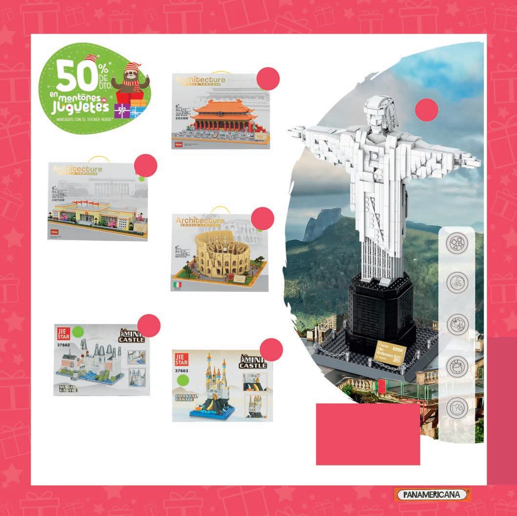 13 JUEGOS Y JUGUETES Inventario sujeto a disponibilidad en los puntos de venta / Consulta las referencias disponibles, precios y sus características en cada punto de venta / Las fotografías no representan el tamaño real de los productos / Los elementos de ambientación no forman parte de los productos / Máximo 2 unidades de productos de tecnología y productos en promoción del mismo código y/o referencia por cliente, por cédula, por factura, por tienda, por evento, por dirección de envío y ventas a crédito / Los precios sin oferta publicados en esta página son precios de lista / Ofertas no acumulables con otras promociones * El descuento aplica para juguetería importada por Panamericana, marcada con el sticker verde y relacionada en la lista física que se encuentra disponible en cada punto de venta CRISTO REDENTOR Precio con dto.: $269.900 PRECIO NORMAL: $539.800 Cód.: 640088 / 100 sets disponibles Precio con dto.: $249.900 PRECIO NORMAL: $499.800 Cód.: 640095 / 100 sets disponibles LA CIUDAD PROHIBIDA Precio con dto.: $289.900 PRECIO NORMAL: $579.800 Cód.: 640082 / 100 sets disponibles GRAN SALÓN DEL PUEBLO (CHINA) Precio con dto.: $249.900 PRECIO NORMAL: $499.800 Cód.: 640081 / 100 sets disponibles COLISEO ROMANO Precio con dto.: $49.900 PRECIO NORMAL: $99.800 Cód.: 640086 / 200 sets disponibles Precio con dto.: $49.900 PRECIO NORMAL: $99.800 Cód.: 640085 / 200 sets disponibles CASTILLO COSTERO CASTILLO MÁGICO Ofertas válidas del 6 al 24 de diciembre de 2022 SETS DE BLOQUES Habilidad creativa Interacción familiar Capacidad de observación Resolución de problemas Habilidad práctica x 2.120 piezas x 973 piezas x 2.798 piezas x 2.210 piezas x 233 piezas x 223 piezas