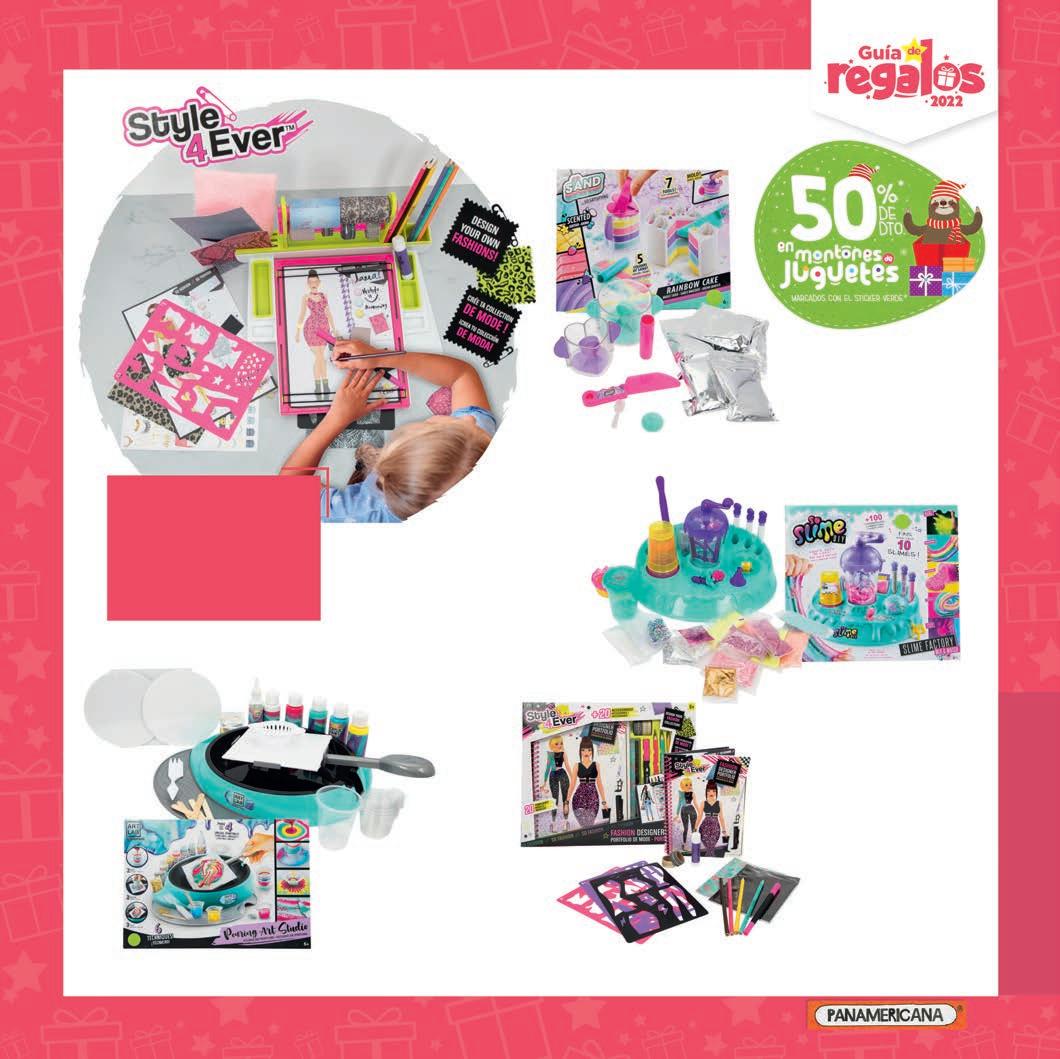 5 JUEGOS Y JUGUETES Inventario sujeto a disponibilidad en los puntos de venta / Consulta las referencias disponibles, precios y sus características en cada punto de venta / Las fotografías no representan el tamaño real de los productos / Los elementos de ambientación no forman parte de los productos / Máximo 2 unidades de productos de tecnología y productos en promoción del mismo código y/o referencia por cliente, por cédula, por factura, por tienda, por evento, por dirección de envío y ventas a crédito / Los precios sin oferta publicados en esta página son precios de lista / Ofertas no acumulables con otras promociones * El descuento aplica para juguetería importada por Panamericana, marcada con el sticker verde y relacionada en la lista física que se encuentra disponible en cada punto de venta Precio con dto.: $84.900 c/u PRECIO NORMAL: $169.800 c/u Cód.: 637999 / 300 unidades disponibles ARENA MÁGICA PARA PASTEL DE ARCOÍRIS CON AROMA Y ACCESORIOS Precio con dto.: $134.900 c/set PRECIO NORMAL: $269.800 c/set Cód.: 637994 / 200 sets disponibles SET FÁBRICA DE SLIME CON ACCESORIOS Precio con dto.: $149.900 c/u PRECIO NORMAL: $299.800 c/u Cód.: 637847 / 200 unidades disponibles Precio con dto.: $89.900 c/u PRECIO NORMAL: $179.800 c/u Cód.: 641157 / 200 unidades disponibles ESTUDIO INFANTIL DE PINTURA CON ACCESORIOS KIT DISEÑO DE MODAS, 20 MODELOS Ofertas válidas del 6 al 24 de diciembre de 2022 KIT ESTUDIO DE MODAS CON ACCESORIOS Precio con dto.: $139.900 PRECIO NORMAL: $279.800 Cód.: 637845 / 120 unidades disponibles