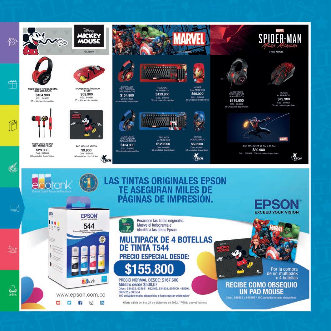 61 Inventario sujeto a disponibilidad en los puntos de venta / Consulta las referencias disponibles, precios y sus características en cada punto de venta / Las fotografías no representan el tamaño real de los productos / Los elementos de ambientación no forman parte de los productos / Máximo 2 unidades de productos de tecnología y productos en promoción del mismo código y/o referencia por cliente, por cédula, por factura, por tienda, por evento, por dirección de envío y ventas a crédito / Los precios sin oferta publicados en esta página son precios de lista / Ofertas no acumulables con otras promociones TECNOLOGÍA CINTIQ DE 16” ONE DE 13” TABLETA DIGITALIZADORA INTUOS BASIC INTUOS PRO TABLETA DIGITALIZADORA INTUOS BLUETOOTH $4.299.900 Cód.: 647922 / 5 unidades disponibles Precio especial: $1.829.900 PRECIO NORMAL: $2.165.900 Cód.: 597504 / 50 unidades disponibles Precio especial: $259.900 PRECIO NORMAL: $286.900 Cód.: 550100 / 100 unidades disponibles Disponible también en color: Disponible también en color: Precio especial: $1.649.900 PRECIO NORMAL: $2.034.900 Cód.: 520688 $959.900 c/u Códs.: 550102 y 634078 Precio especial: $979.900 PRECIO NORMAL: $1.076.900 Cód.: 583312 80 unidades totales disponibles 100 unidades totales disponibles 100 unidades totales disponibles 1. 2. Precio especial: $439.900 c/u PRECIO NORMAL: $512.900 c/u Códs.: 550101 y 634077 5. 4. 3. M M S S Ofertas válidas del 10 al 20 de diciembre de 2022 $179.900 100 unidades disponibles $164.900 50 unidades disponibles $64.900 50 unidades disponibles $247.900 50 unidades disponibles Precio especial: $149.900 PRECIO NORMAL: $459.900 50 unidades disponibles Precio especial: $149.900 PRECIO NORMAL: $459.900 100 unidades disponibles Precio especial: $189.900 PRECIO NORMAL: $259.900 50 unidades disponibles Precio especial: $799.900 PRECIO NORMAL: $1.399.900 10 unidades disponibles Ofertas válidas del 6 al 24 de diciembre de 2022