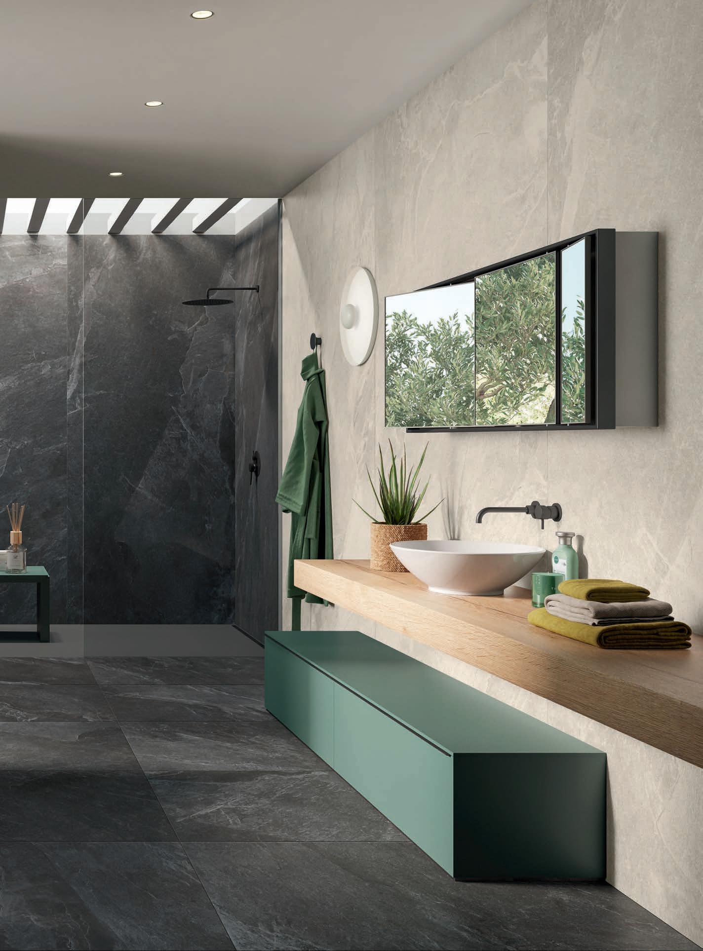 Stone Trace espande la percezione di continuità delle superfici rivestendo gli ambienti come una seconda pelle, perfettamente a misura con l’altezza delle pareti, senza tagli e aggiunte per il massimo comfort visivo nel nostro ritmo quotidiano che alterna lavoro e relax. Grazie allo spessore sottile delle lastre abbiamo potuto rinnovare molti spazi della nostra casa con facilità, senza demolizioni, semplicemente sovrapponendole ai pavimenti e rivestimenti esistenti, con un importante risparmio di spesa e guadagno di tempo.