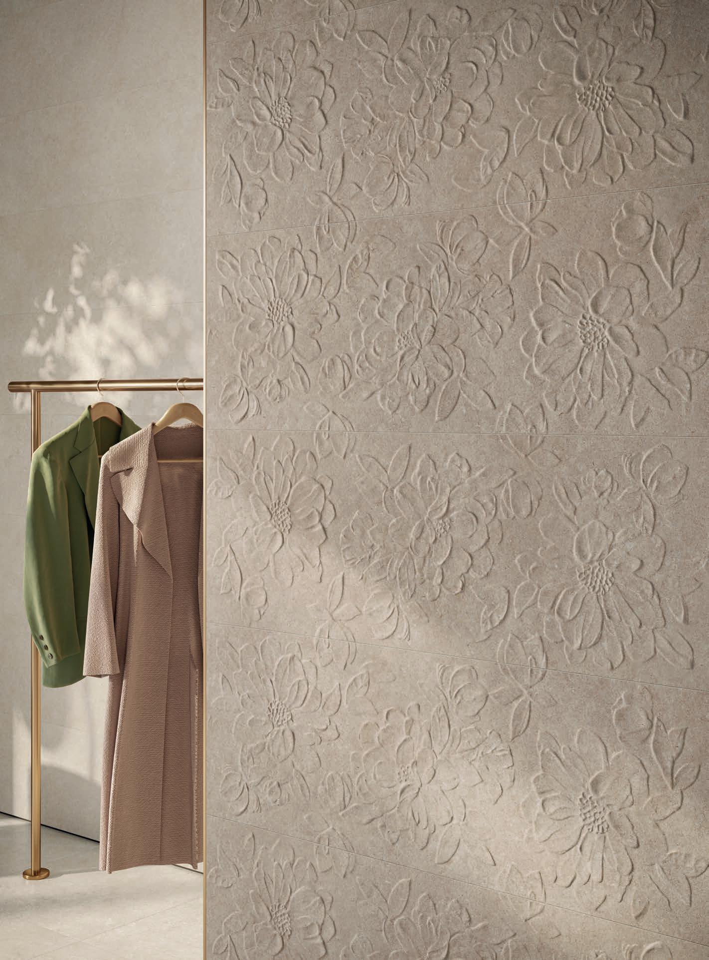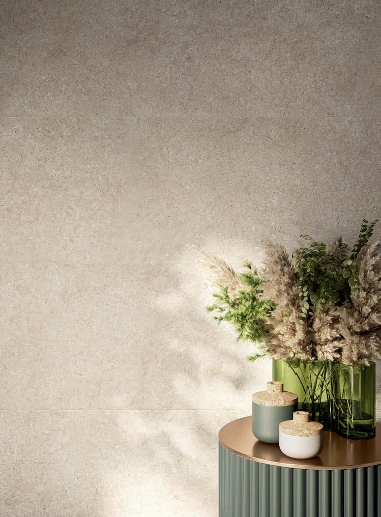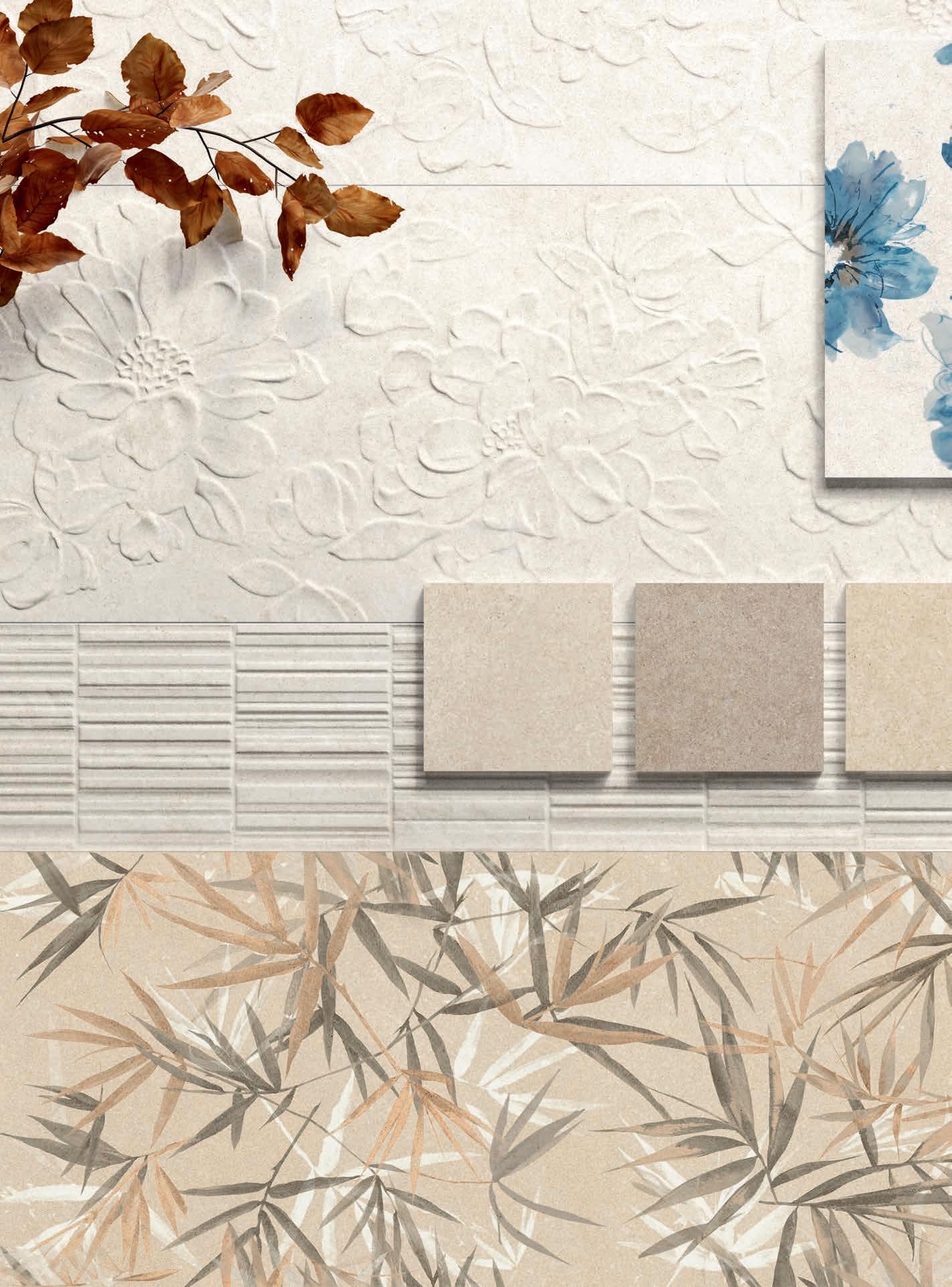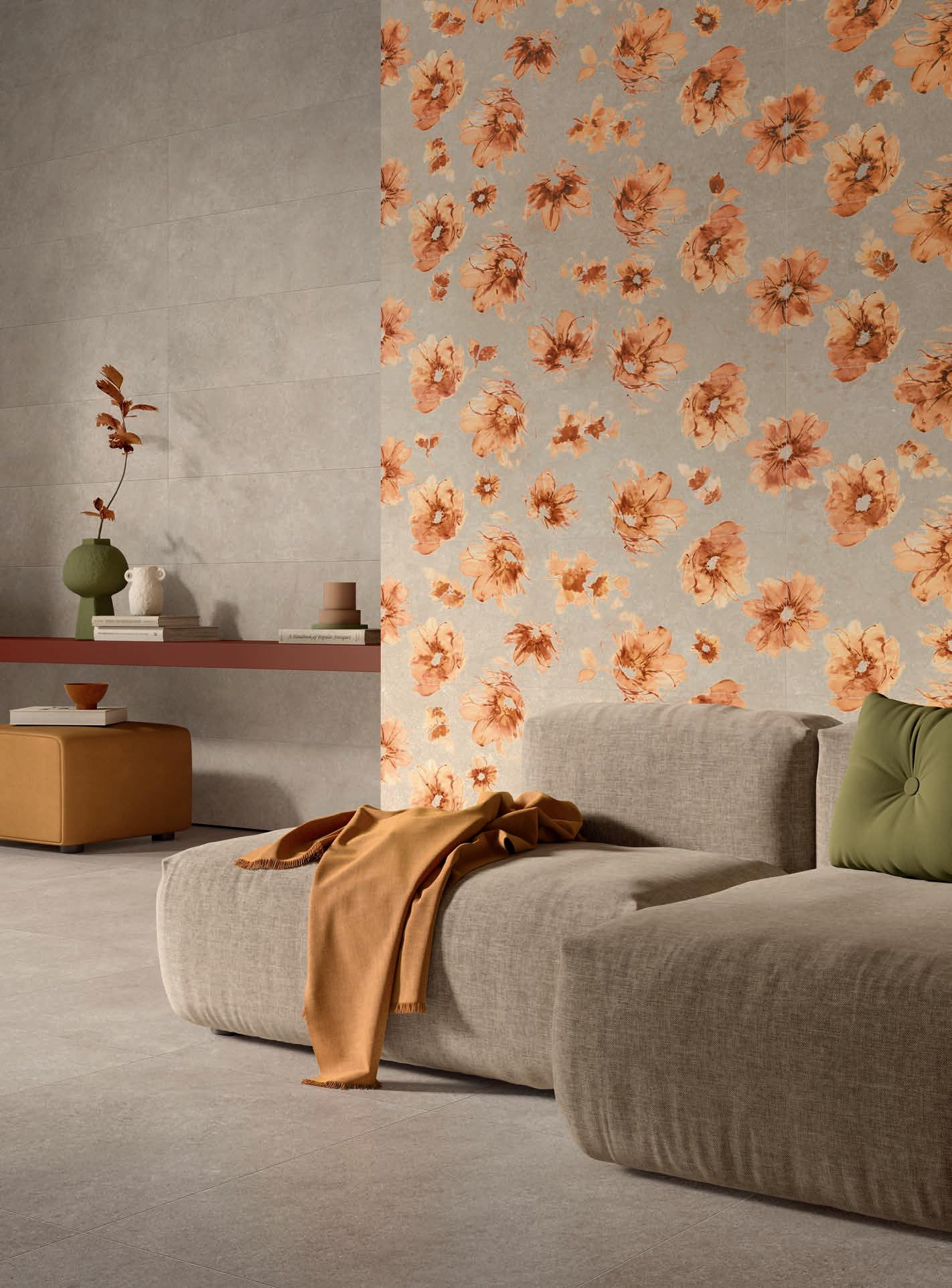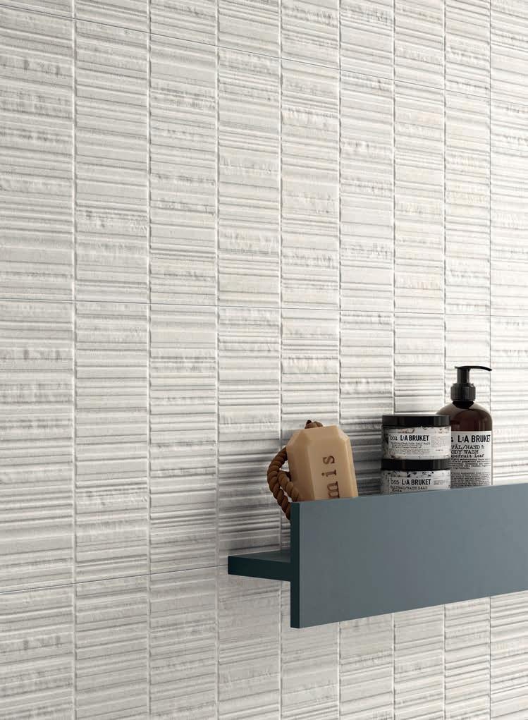 Una collezione contemporanea dal look rassicurante e confortevole, anche grazie alla leggera texture effetto pietra e ai toni soft, freschi e naturali, alternati ad accenti di colore.
