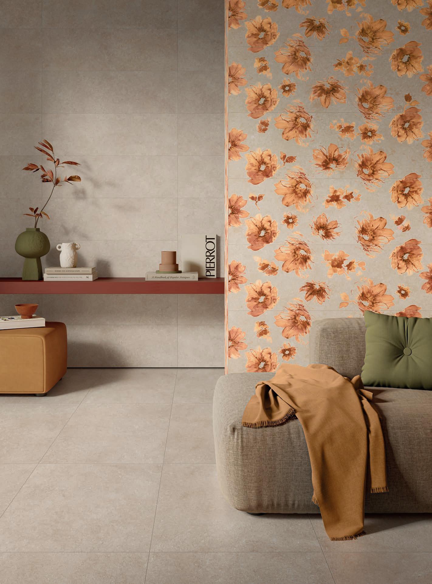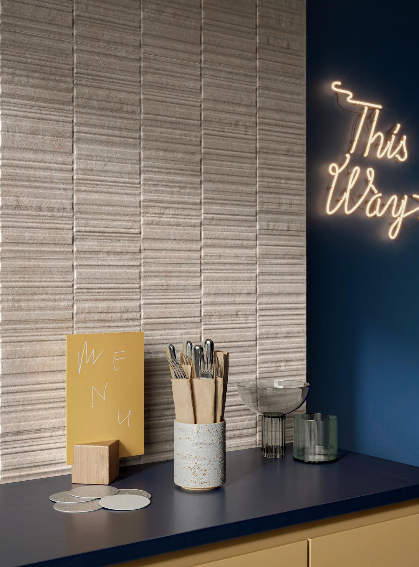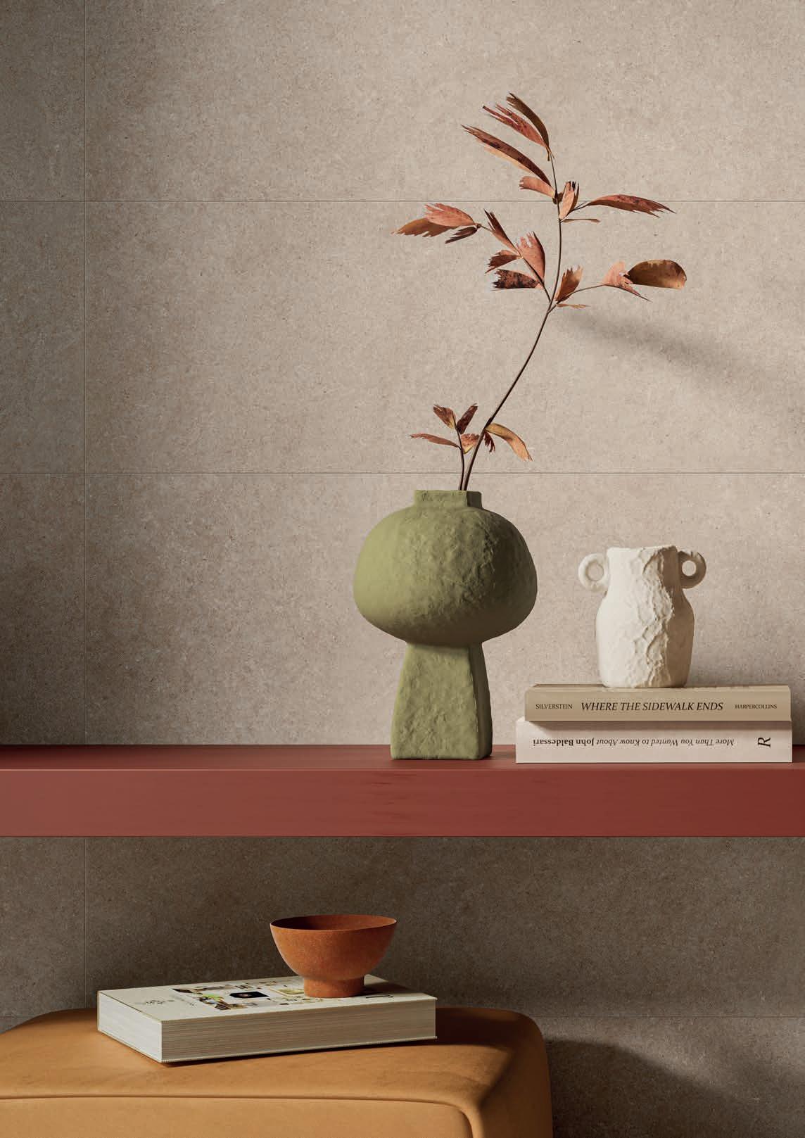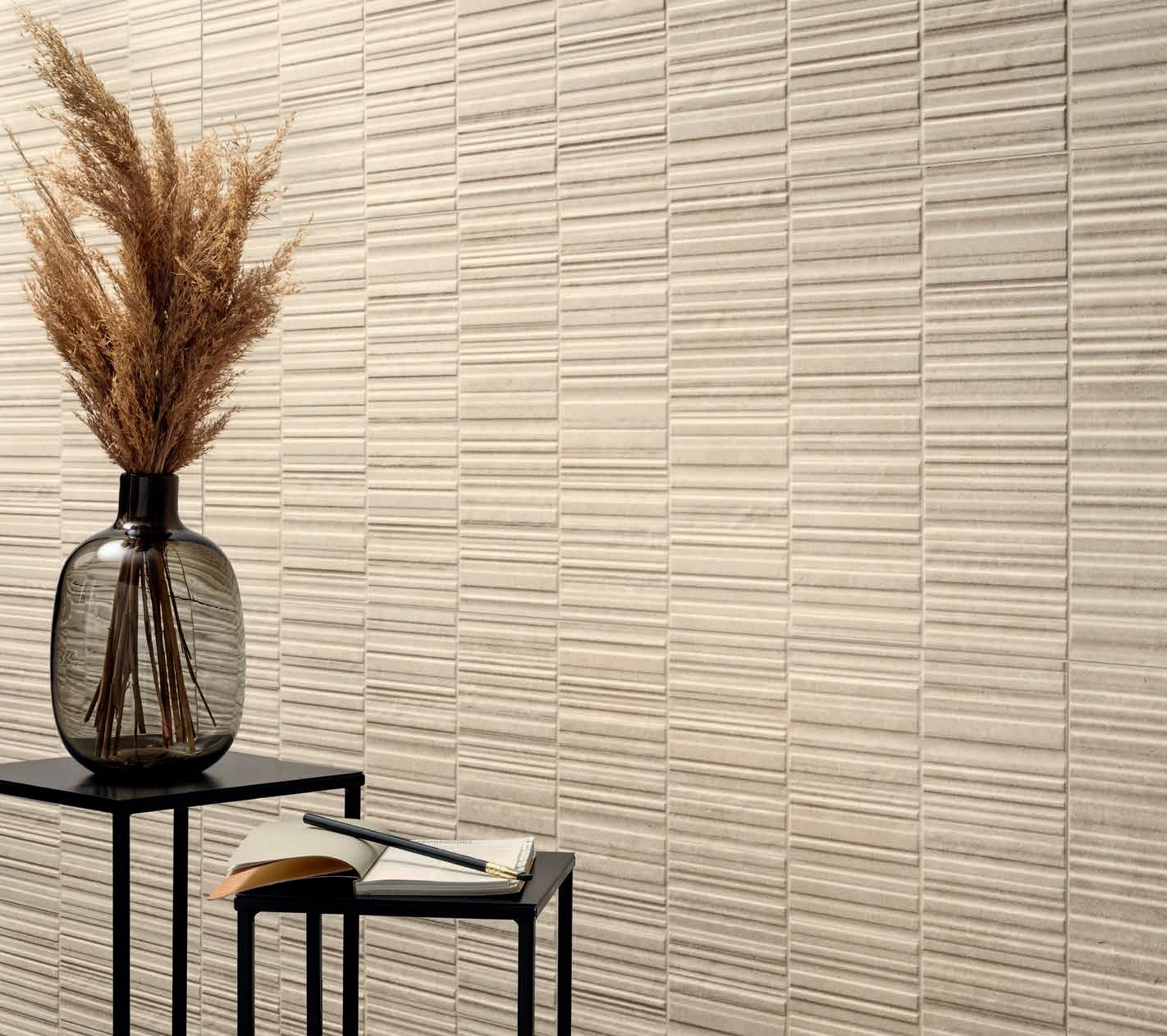 Una collezione contemporanea dal look rassicurante e confortevole, anche grazie alla leggera texture effetto pietra e ai toni soft, freschi e naturali, alternati ad accenti di colore.