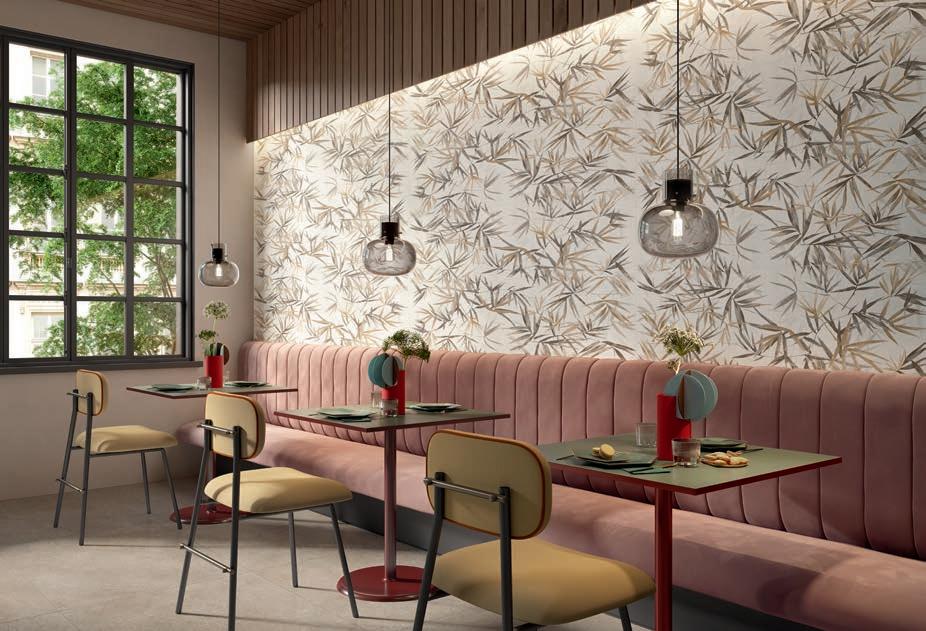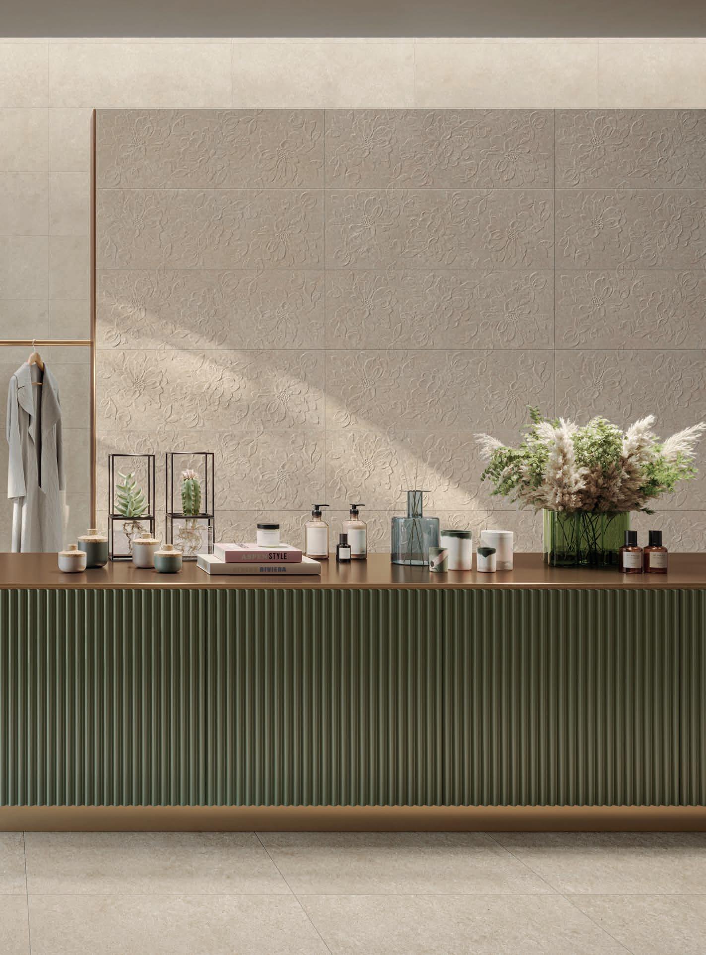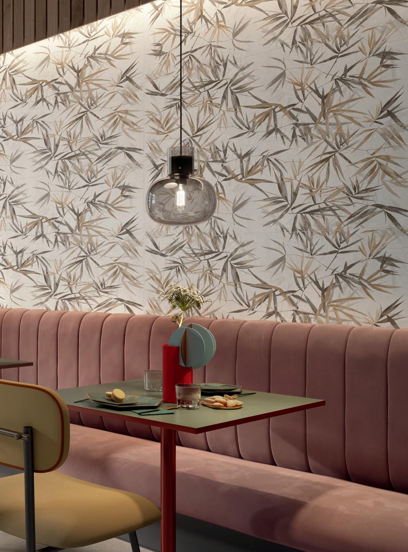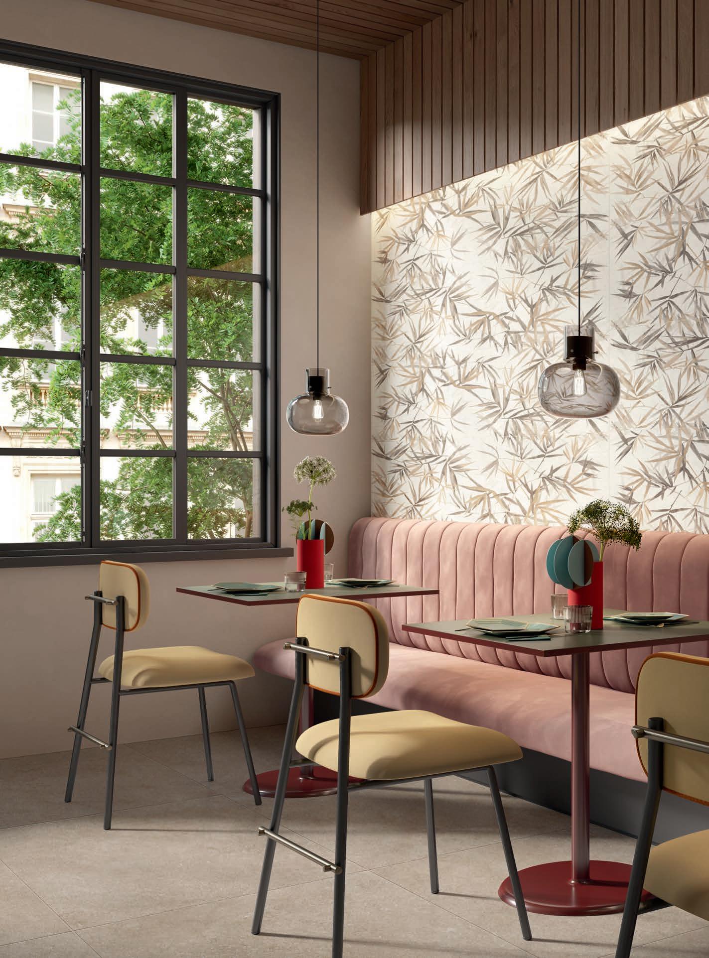 Welcoming and elegant commercial spaces, with natural colors and delicate motifs, for inserts, bands or full-height walls: Iqoniqa is the ceramic decoration that combines style and practicality, personality and strength. Thanks to high-temperature firing, in fact, the graphic textures are at one with the ceramic, becoming extremely resistant.