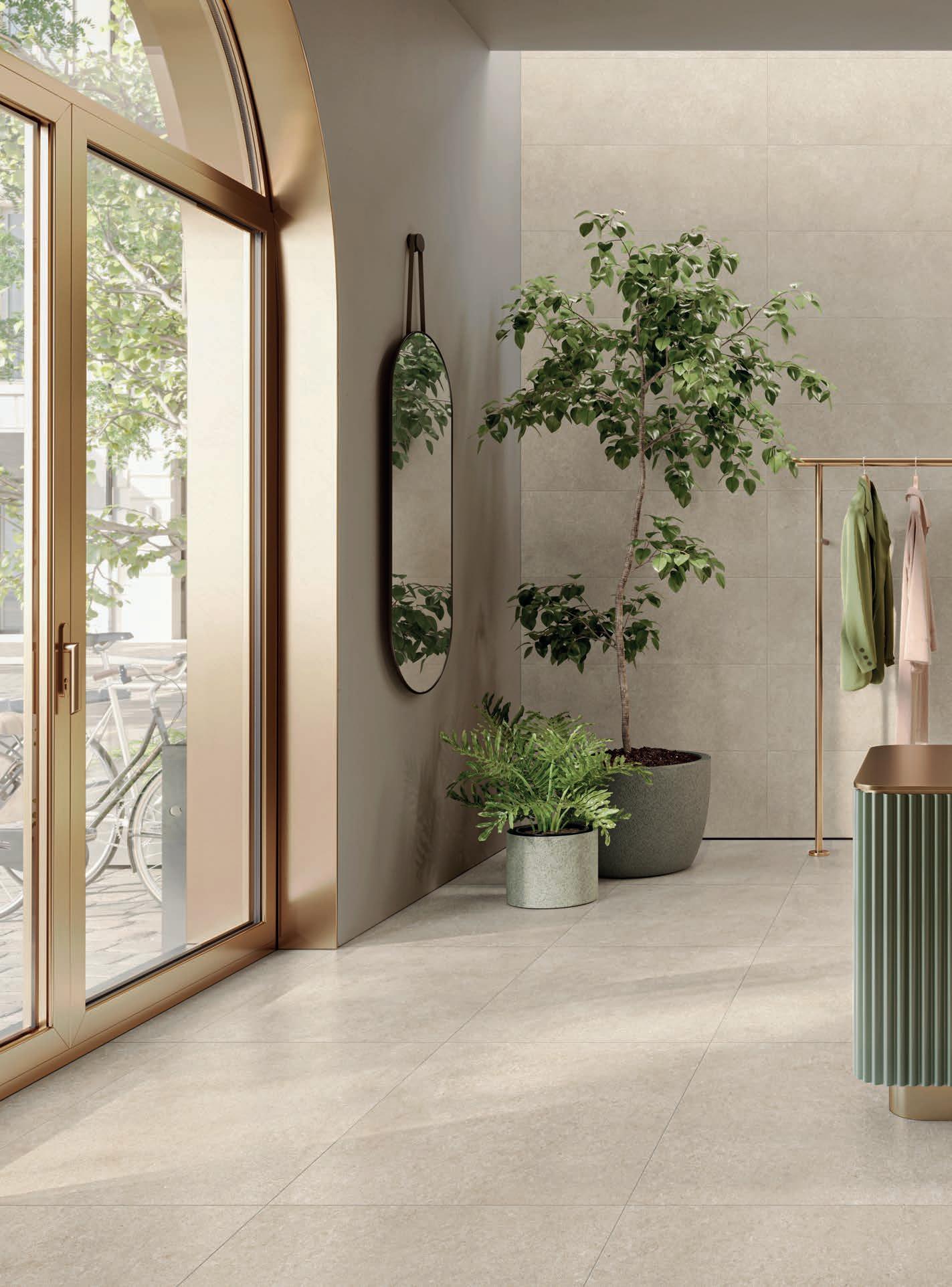 A contemporary collection with a reassuring and comfortable look, also thanks to the light stone-effect texture and soft, fresh and natural tones, alternating with color accents.
