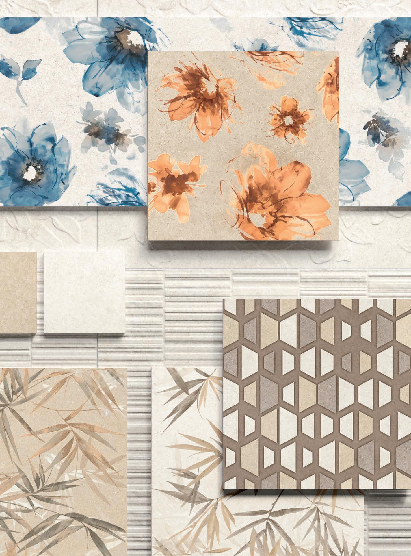 Due decori 3D su tutte le tinte, un motivo geometrico largamente abbinabile e due texture floreali in due varianti cromatiche.