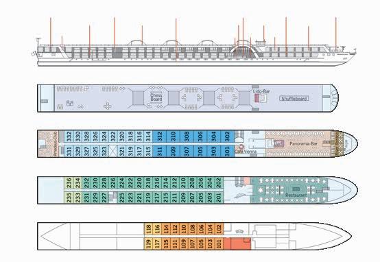 — Camarotes de los puentes Mozart y Strauss, con ventanas panorámicas abatibles que ofrecen una vista completamente abierta, vestidor y minibar totalmente equipado*.